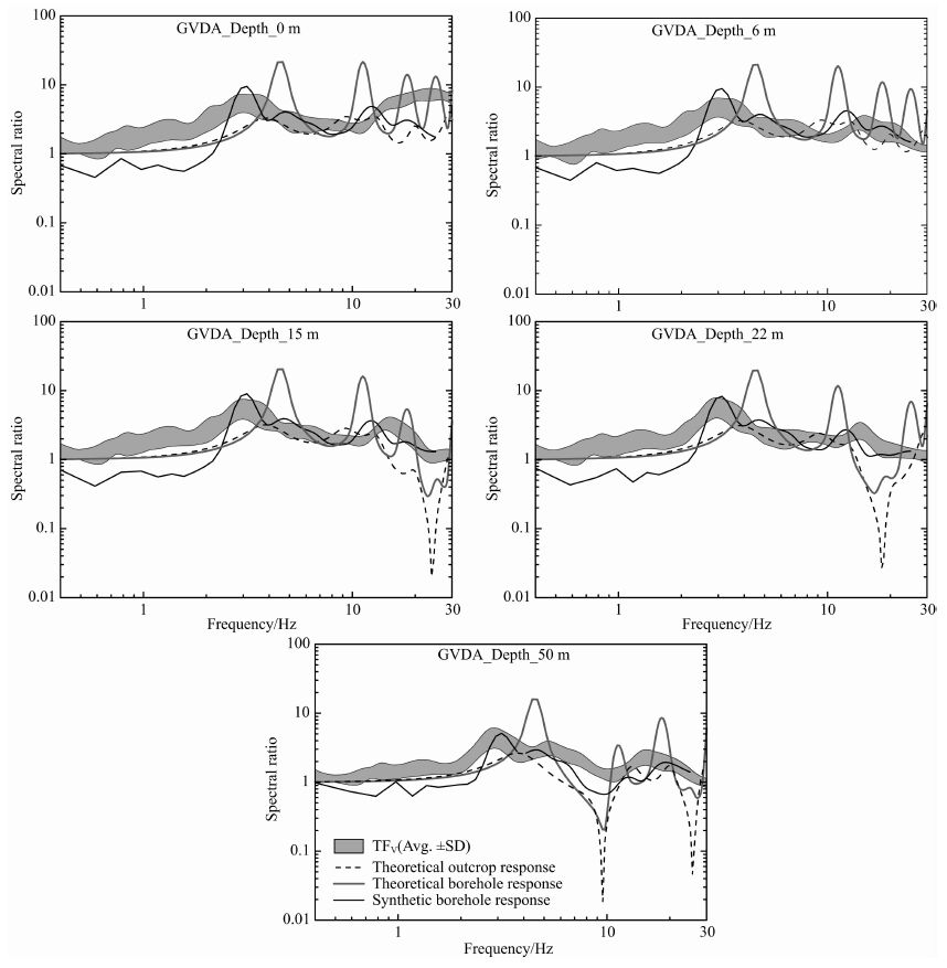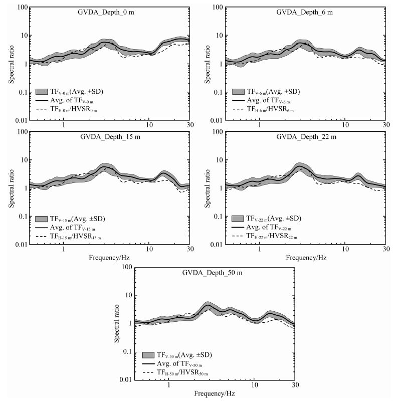 由此可知,TF与HVSR的比值能用竖向场地反应来表征.本文利用不同层位竖向地震动的S波 传递函数来表示竖向场地反应,参考场点选为150 m 处,20次地震事件的竖向地震反应均值用图 8中粗实线表示,均值加减一倍方差(Avg.±SD)所示的范围用阴影区域表示,虚线为TF与HVSR均值曲线的比值.图 8中图例TFH-0 m中下标“H”表示水平分量,“0 m”表示计算传递函数时分子对应的地震动时程的位置,分母均对应参考场地即深度150 m处的基岩地震动傅里叶谱,TFV-0 m中下标“V”表示垂直分量,“0 m”含义与TFH-0 m中的一致.由图 8可知,TF与HVSR均值曲线的比值与阴影区域无论谱形还是幅值均基本一致,表明HVSR与传递函数的幅值差异即为场地的竖向放大.