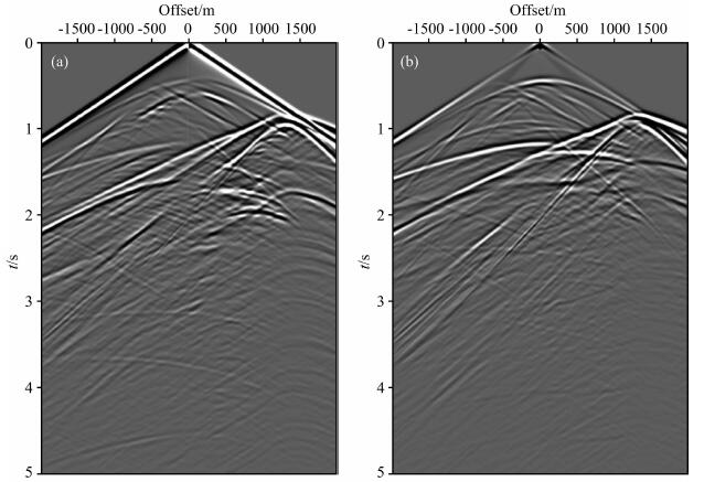 图 13 2D弹性SEG/EAGE盐丘模型第151炮单炮记录 (a)和(b)分别为记录的x和z分量 Fig. 13 Record of the 151st shot in 2D elastic SEG/EAGE salt model (a)and(b)are x and z components of the record,respectively. |