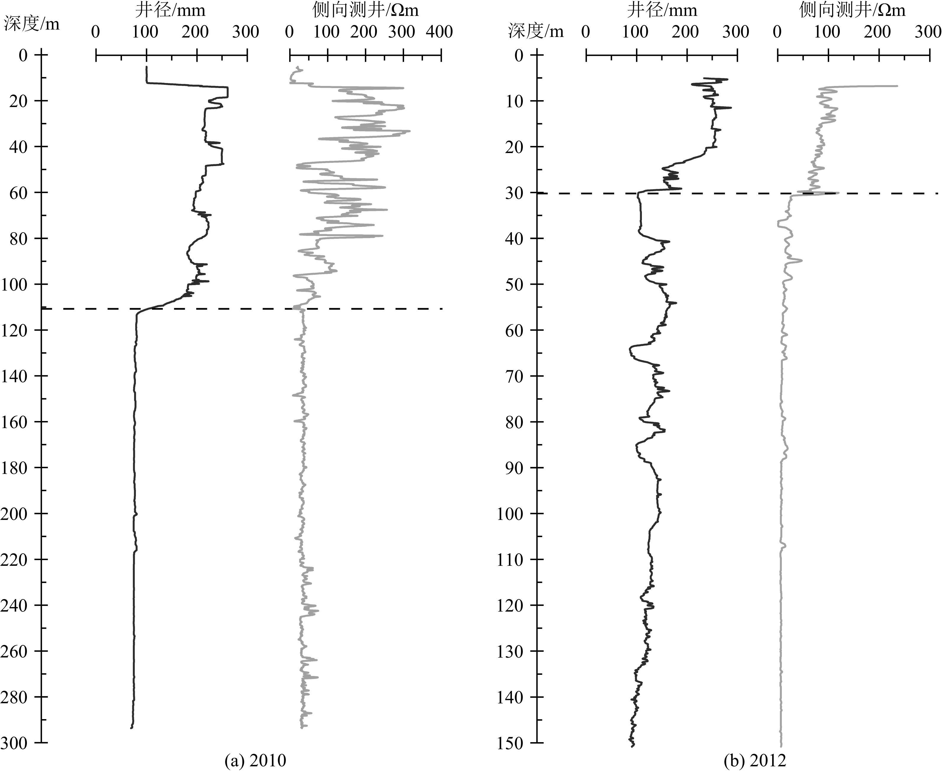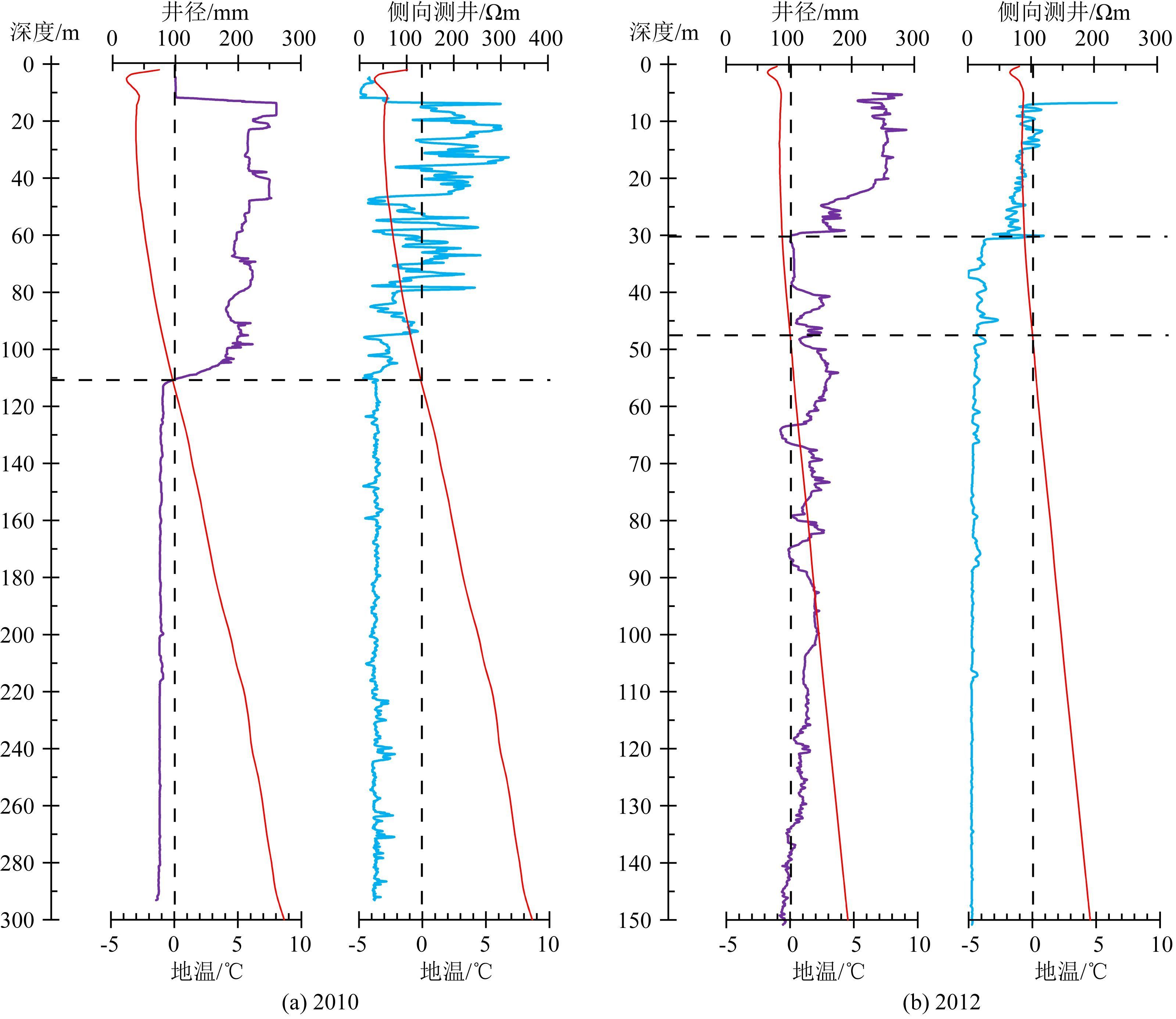 图 4a是2010年钻孔的两组测井数据对比图.从图 4a中可以看到,井径曲线的特征明显地分成为2个部分:从10 m到110 m左右,井径在一个较大的尺寸范围内变化,幅度为260~82.58 mm,平均孔径约为207 mm;从110 m到290 m,井径变化较小,幅度为82.58~69.29 mm,平均约为76 mm.图 4a中还显示,侧向测井曲线的变化也与井径曲线的变化类似,都是以110 m左右为分界,110 m以上电阻率波动较为剧烈,幅度为317~75 Ωm,平均约为122 Ωm,110 m以下则相对变化较小,幅度为75~8 Ωm,平均约为35 Ωm.作为两组测井数据数值分界点的110 m,与钻探编录判断的多年冻土底板深度基本一致.