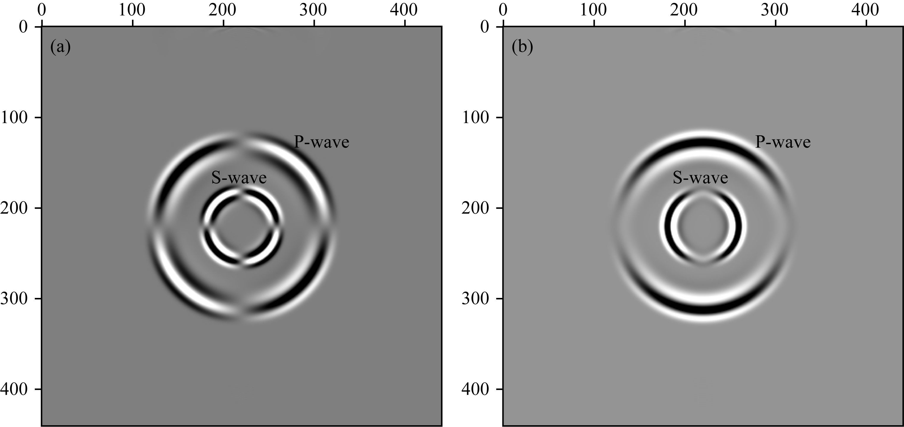 图 1 250 ms时刻地震波场快照 (a)水平分量;(b)垂向分量. Fig. 1 Snapshots at 250 ms (a)Horizontal component;(b)Vertical component. |