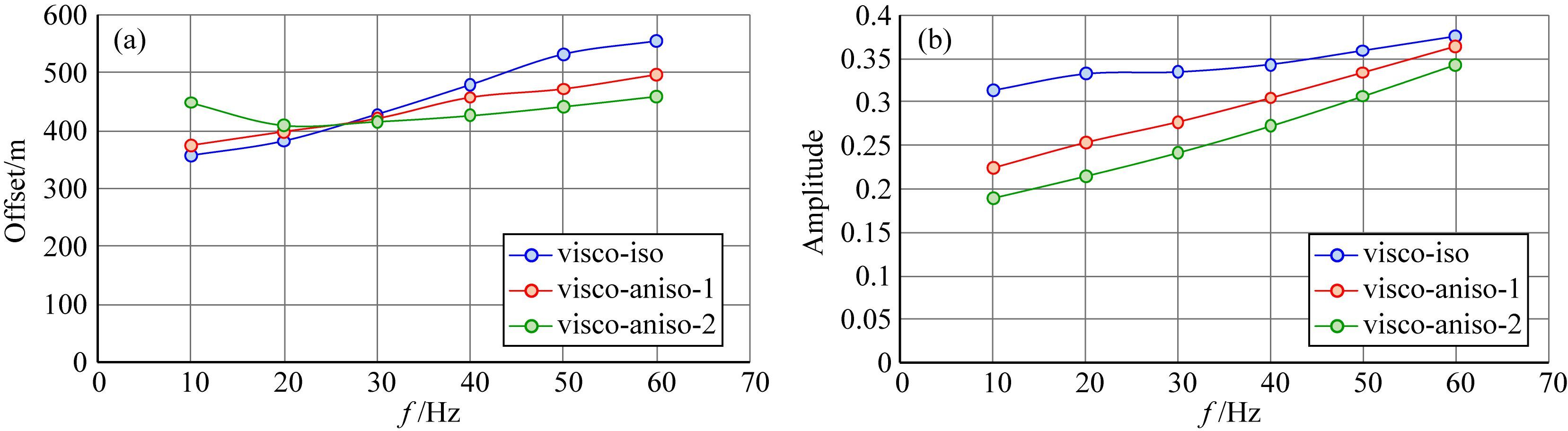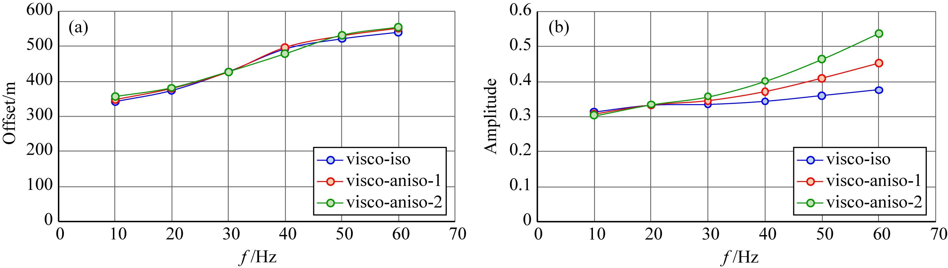 图 10 (a) VTI各向异性衰减介质单频振幅的极值点位置和(b)极值点振幅随频率的变化 其中:visco-iso:各向同性衰减;visco-aniso-1:ε=0.11、δ=0.09时各向异性VTI衰减;visco-aniso-2:ε=0.21、δ=0.19时各向异性VTI衰减. Fig. 10 (a) Position of extreme point in viscoelastic VTI media;(b)Magnitude of the extreme point changing with frequency Symbol meaning: visco-iso: isotropic-viscoelastic media. visco-aniso-1: viscoelastic VTI media with ε=0.11 and δ=0.09. visco-aniso-2: viscoelastic VTI media with ε=0.21 and δ=0.19. |