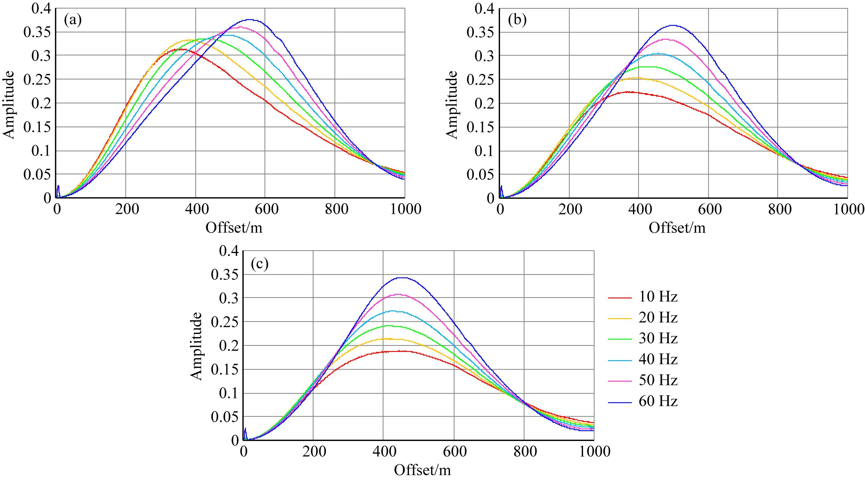 我们从合成记录的水平分量上提取转换波振幅,图 9a是衰减介质PS单频曲线对比图,频率范围和PP波单频分析范围相同:10~60 Hz,由图 9a可见,10 Hz单频振幅(红色)达到最大值前,相同偏移距处,单频振幅值随着频率的增加而降低,60 Hz时振幅最小,10 Hz时振幅最大.单频振幅曲线的极值点位置随着频率的增加向远偏移距方向移动,且极值点随着频率增加而增大.在单频振幅达到极值点前,振幅曲线都近似为一条直线,直线梯度随着频率增加而降低.