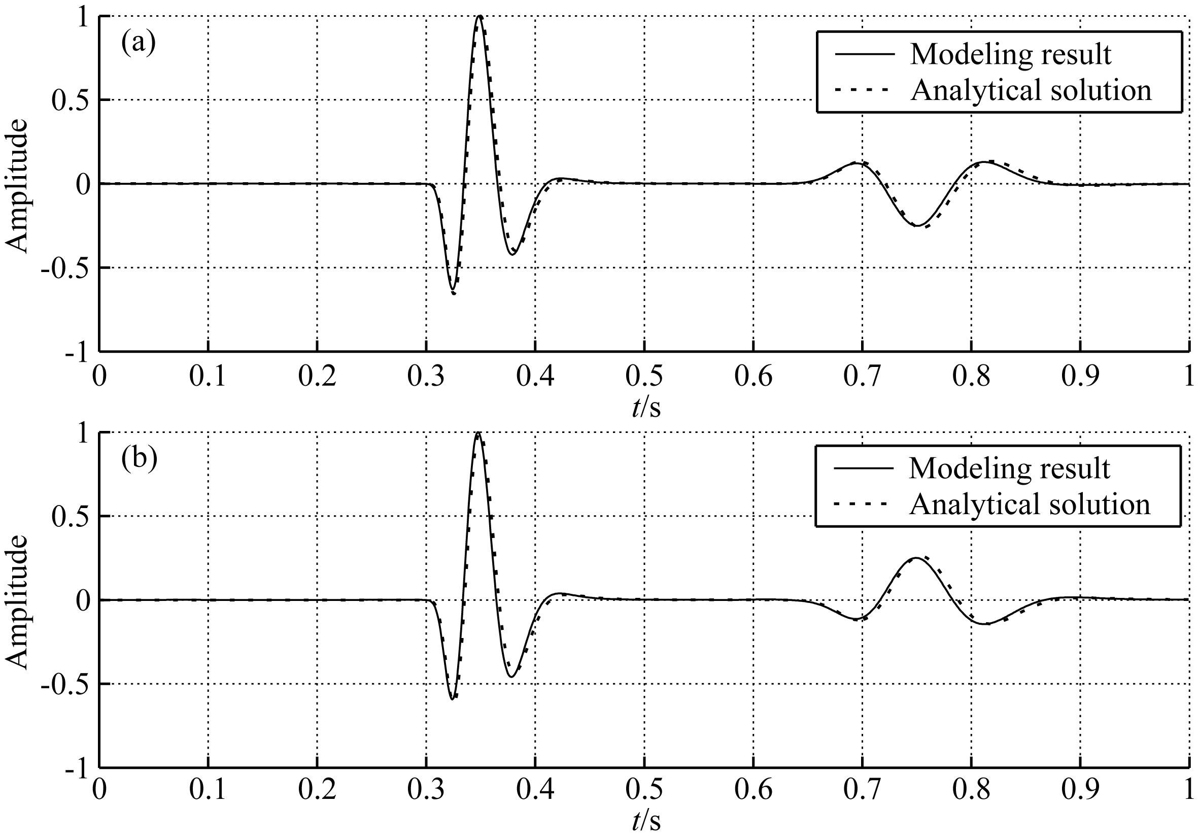 图 2 数值模拟结果与解析解对比 (a)水平分量;(b)垂向分量. Fig. 2 Comparison of modeling result and analytical solution (a)Horizontal component;(b)Vertical component. |