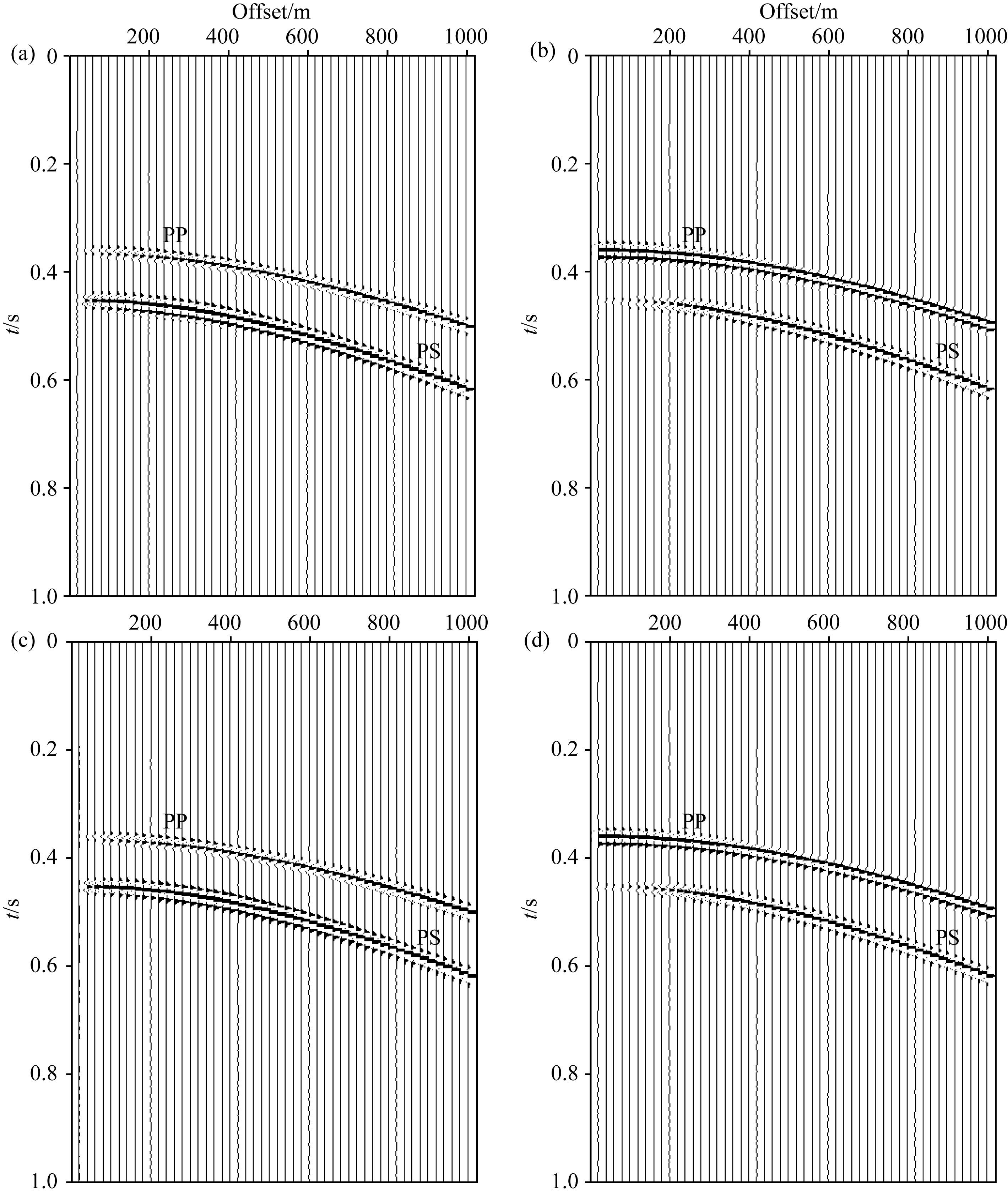 模型参数分别为各向同性弹性(模型2a)和各向异性衰减(模型2d)情况下的合成记录如图 4所示,图中PP表示纵波反射,PS表示转换波.偏移距500 m处地震波形(图 5)显示,均匀弹性介质的纵横波振幅明显强于各向异性衰减介质.