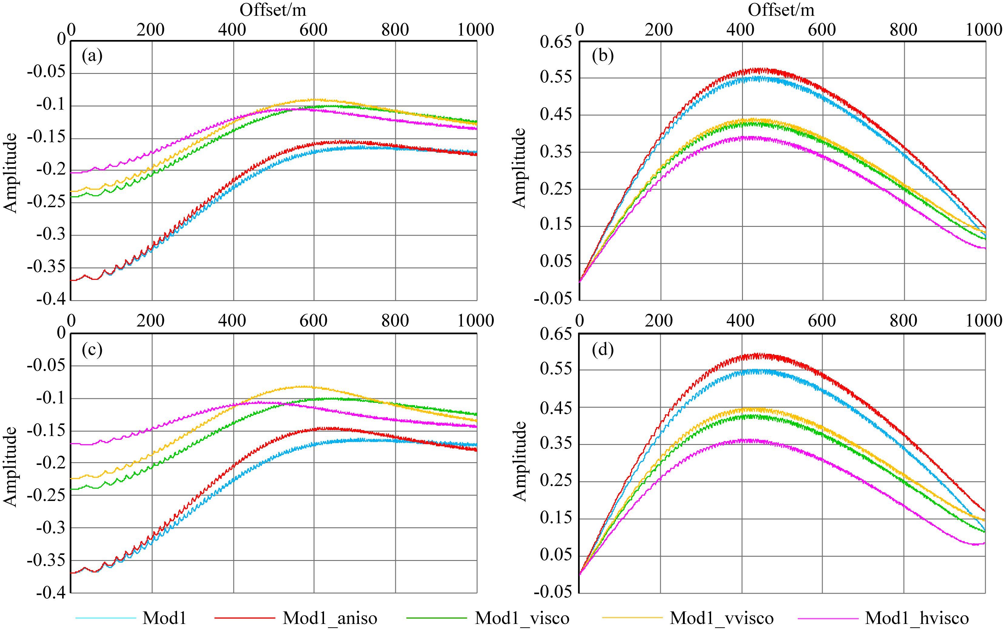 图 6 AVO振幅曲线对比 (a)PP波;(b)PS波;(c)更新各向异性参数后PP波;(d)更新各向异性参数后PS波.每个子图中曲线分别表示为:mod1-各向同性弹性介质,mod1_aniso-VTI弹性介质,mod1_visco-各向同性衰减介质,mod1_vvsico-VTI衰减介质,mod1_hvisco-HTI衰减介质. Fig. 6 Comparison of AVO responses (a)PP waves;(b)PS waves;(c)PP waves after updating anisotropic parameters;(d)PS waves after updating anisotropic parameters. Symbol meaning:mod1: isotropic-elastic media. mod1_aniso: elastic VTI media. mod1_visco: isotropic-viscoelastic VTImedia.mod1_vvsico: viscoelastic VTI media. mod1_hvisco: viscoelastic HTI media. |