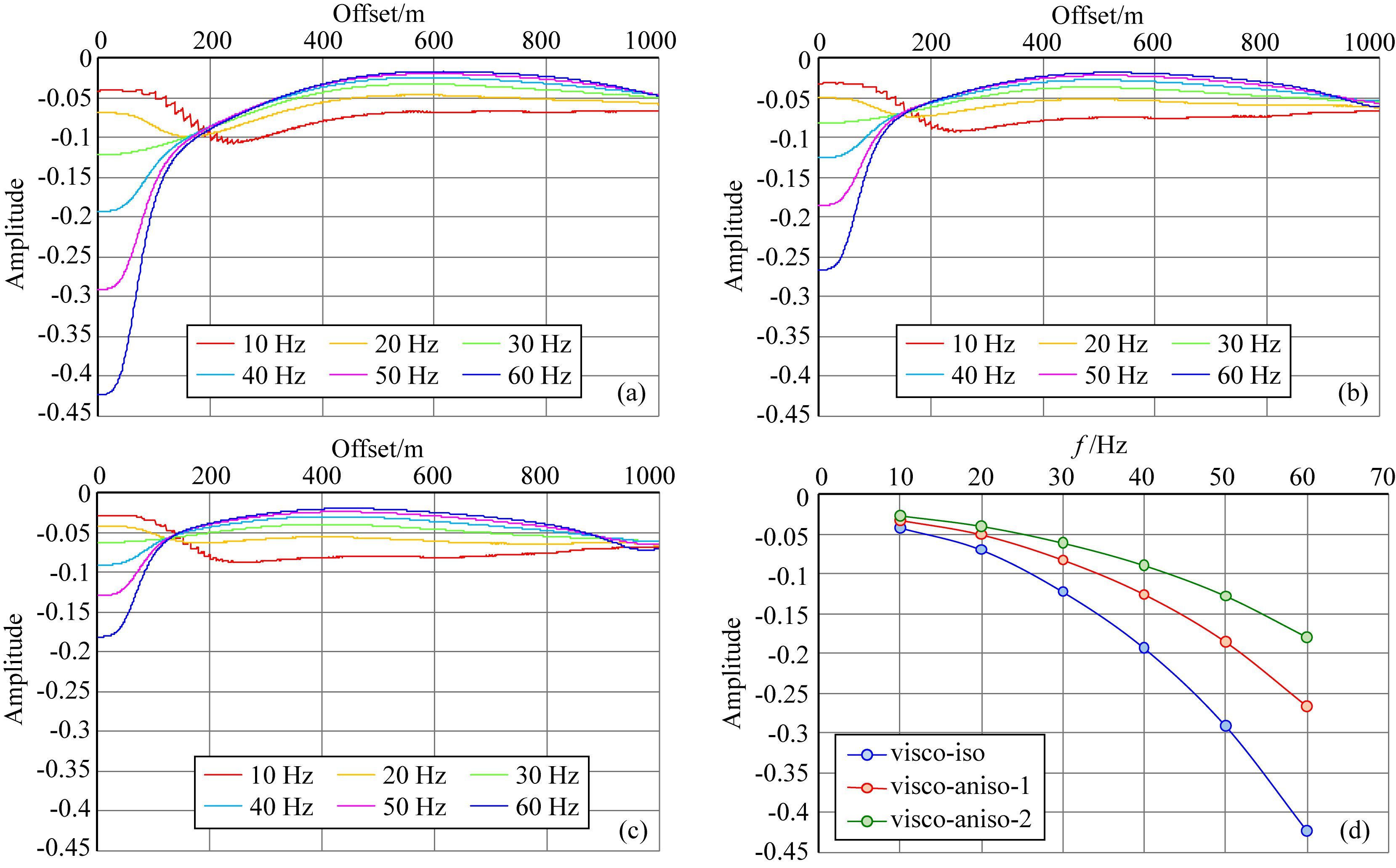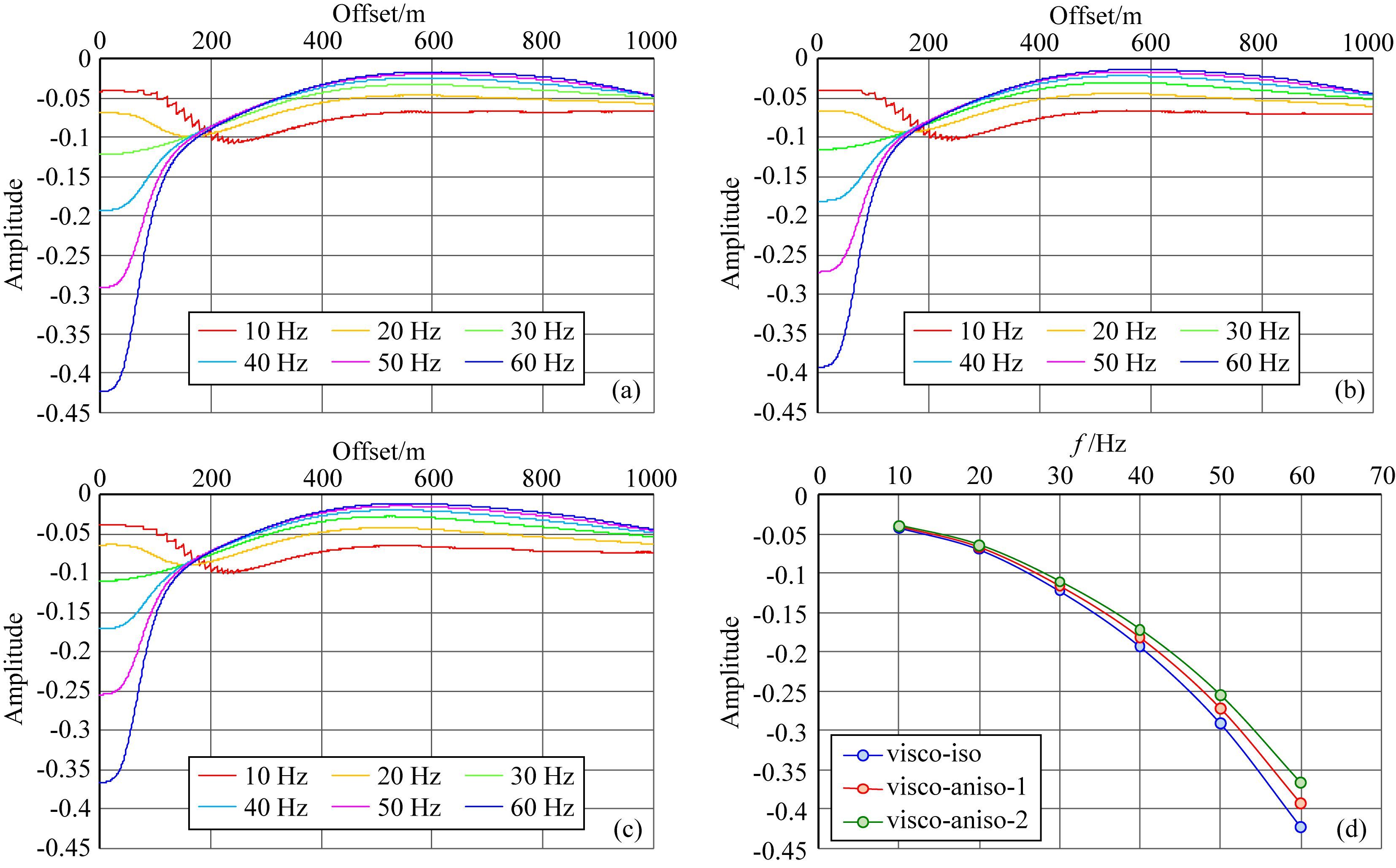 图 8 (a)各向同性衰减单频曲线;(b)HTI各向异性衰减ε=0.11、δ=0.09曲线;(c)HTI各向异性衰减ε=0.21、δ=0.19曲线;(d)单频振幅曲线在零偏移距的振幅 其中:visco-iso:各向同性衰减;visco-aniso-1:ε=0.11、δ=0.09时各向异性衰减;visco-aniso-2:ε=0.21、δ=0.19时各向异性衰减. Fig. 8 (a) Single-frequency attenuation curves of isotropic-viscoelastic media;(b)Viscoelastic HTI media with ε=0.11 and δ=0.09;(c)Viscoelastic HTI media with ε=0.21 and δ=0.19;(d)Magnitude curve at zero offset Symbol meaning: visco-iso: isotropic-viscoelastic media. visco-aniso-1: viscoelastic HTI media with ε=0.11 and δ=0.09. Visco-aniso-2: viscoelastic HTI media with ε=0.21 and δ=0.19. |