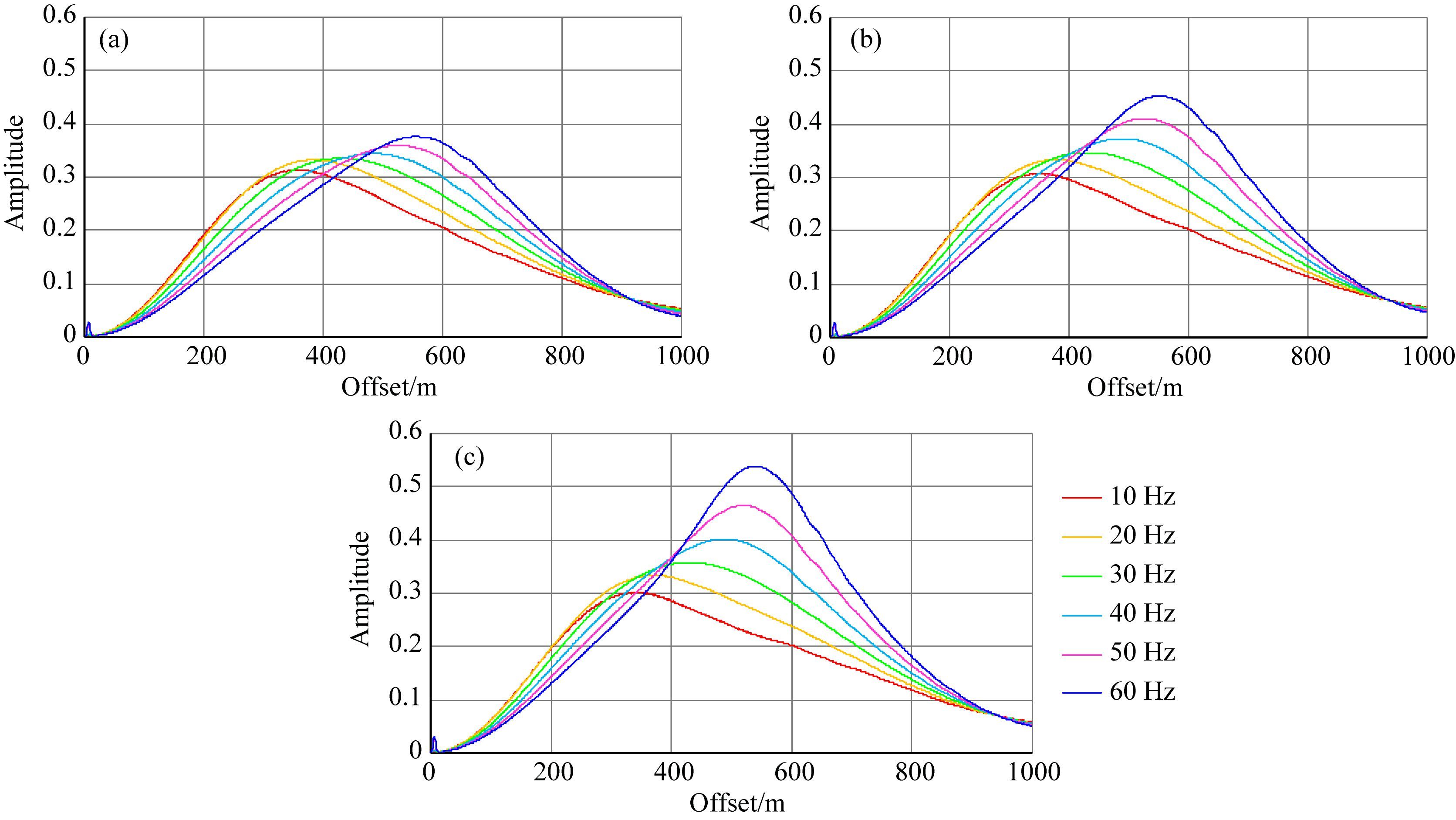 ε=0.11、δ=0.09(图 9b)和ε=0.21、δ=0.19(图 9c)时VTI各向异性衰减PS单频振幅变化趋势和图 9a相似,10 Hz时,三种介质单频曲线的幅值、极值点相同(红色曲线),随着频率的增加,振幅和极值点均发生变化,但有一定规律,我们提取三种介质的极值点和极值点对应的偏移距(图 10),提取结果显示随着介质各向异性增强,单频振幅曲线的极值点位置几乎重合在一起,但三类介质的极值点幅值在不同单频时显示为不同数值,10、20 Hz处,三类介质极值相同,而30、40、50、60 Hz处,极值差异越来越大.
