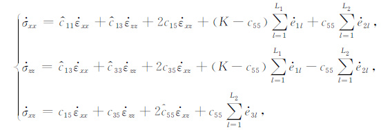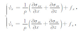 其中,vx、vz表示质点在x和z方向的速度,上标“·”表示变量的时间导数,σxx、σzz、σxz是法向应力和切应力分量,ρ是介质密度,fx、fz是x和z方向外力.各向异性衰减介质本构关系为: