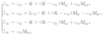 其中,L1表示纵波的黏弹性模型并联个数,L2表示横波的黏弹性模型并联个数,本文假设L1=L2=1,$\hat{c}$ij是高频情况的弹性系数,cij是介质弹性条件下弹性系数,$\dot{\varepsilon }$xx、$\dot{\varepsilon }$zz、$\dot{\varepsilon }$xx为应变的时间导数,K为常量,数值为(c11+c33)/2,Mui是t=0时刻的松弛函数,当i=1时表示纵波松弛,i=2表示横波松弛,其一般表达形式为