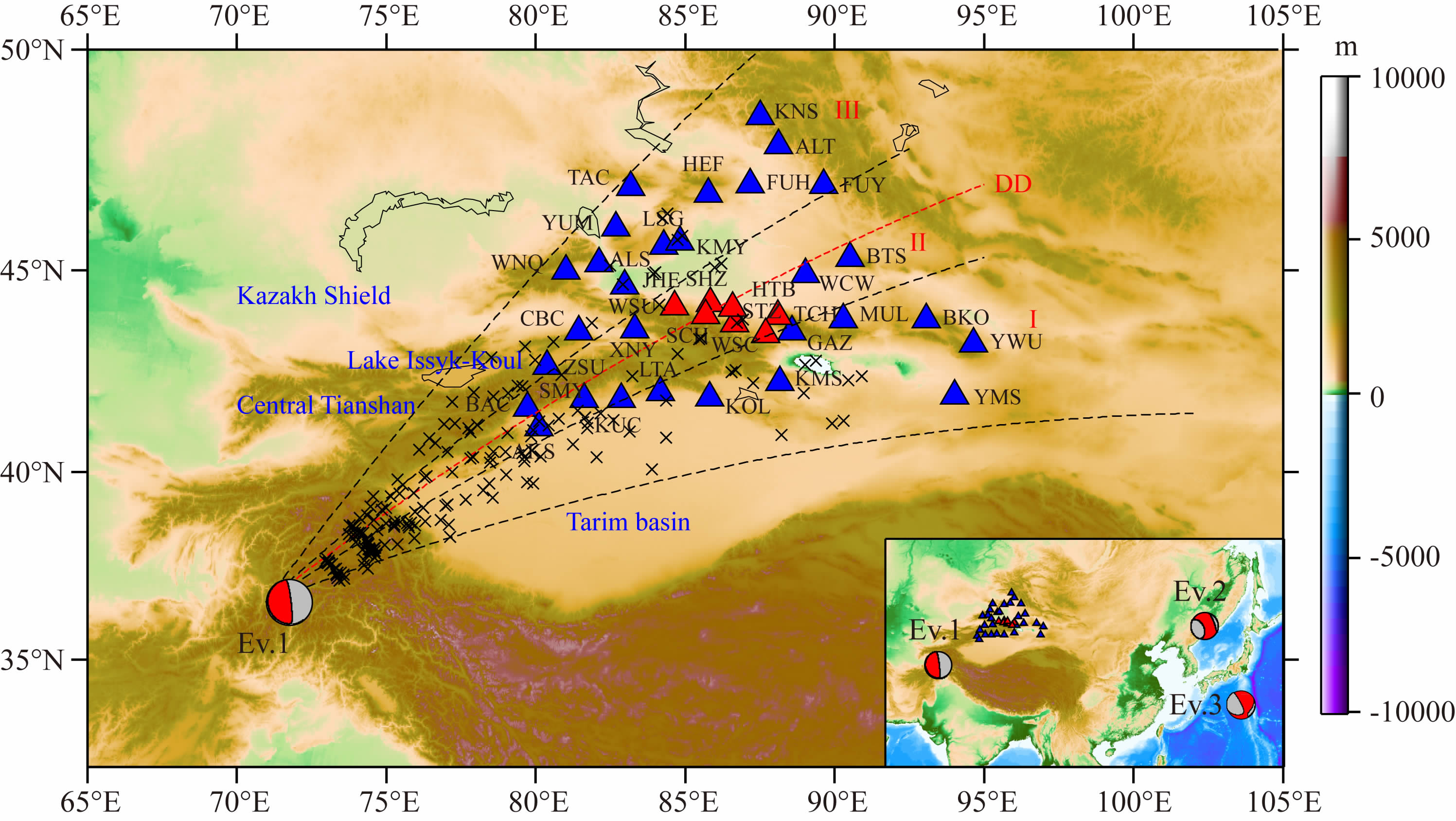 图 1 地震震中位置和台站分布图 图中沙滩球表示地震震源机制解. 震源参数信息详见表 1,其中Ev.1主要用于P波三重震相研究; 插图中Ev.2和Ev.3用于中天山东北部下方局部低速异常体远震测试; 三角形标出了台站的位置,其中红色三角形表示P波走时出现明显延迟的台站; I,II和III表示三个研究子区域; 黑色叉号为P波射线在375 km深度上的穿透点在地表的投影. Fig. 1 The locations of earthquakes(beach balls)and seismic stations used in the study The beach balls represent focal mechanisms with detailed source information given in Table 1. Ev.1 is used in P-wave triplication; Ev.2 and Ev.3(in the lower inset)provide the teleseismic waveforms to constrain the local anomaly beneath northeastern part of central Tian Shan; The triangles indicate the locations of seismic stations,of which the red ones represent the seismic stations with P-wave arrival distinctly delayed; I,II and III label three profiles in the whole area. Black crosses indicate the ground projections of the piercing points at 375 km depth. |