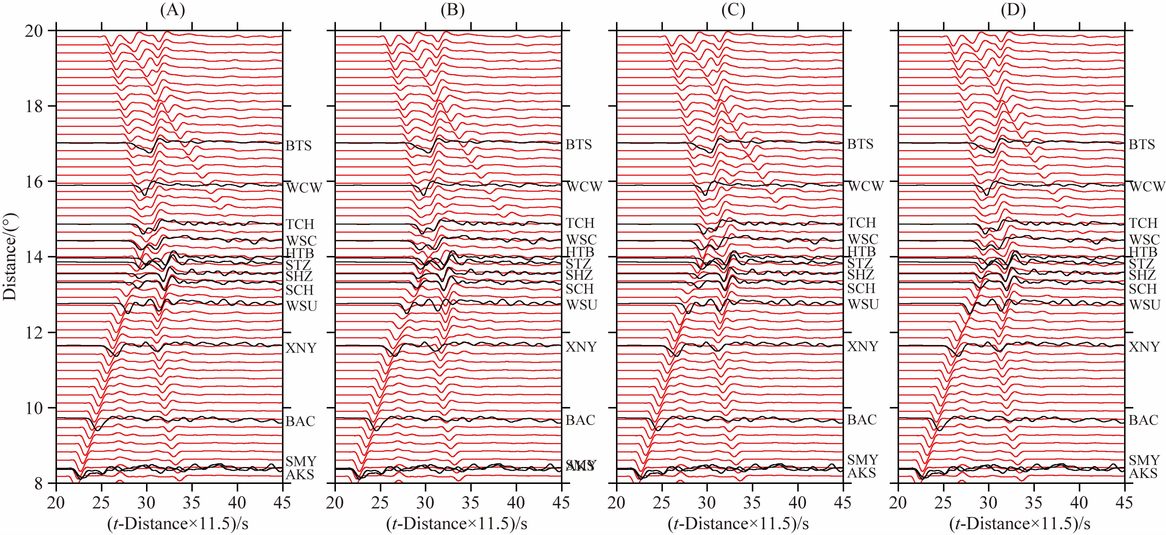 图 10 II子区域观测波形和低速异常体模拟测试合成波形 图中黑色波形为Ev.1 观测波形;图A,B,C和D 中红色波形为不同异常体位置(图 9A,B,C和D)合成波形. Fig. 10 Comparison of observed and test synthetic waveforms for the profile II The black waveforms represent the observed seismograms and the red seismograms are 2D-FD synthetic waveforms based on the test models A,B,C and the best-fitting model D(in Fig. 9),respectively. |