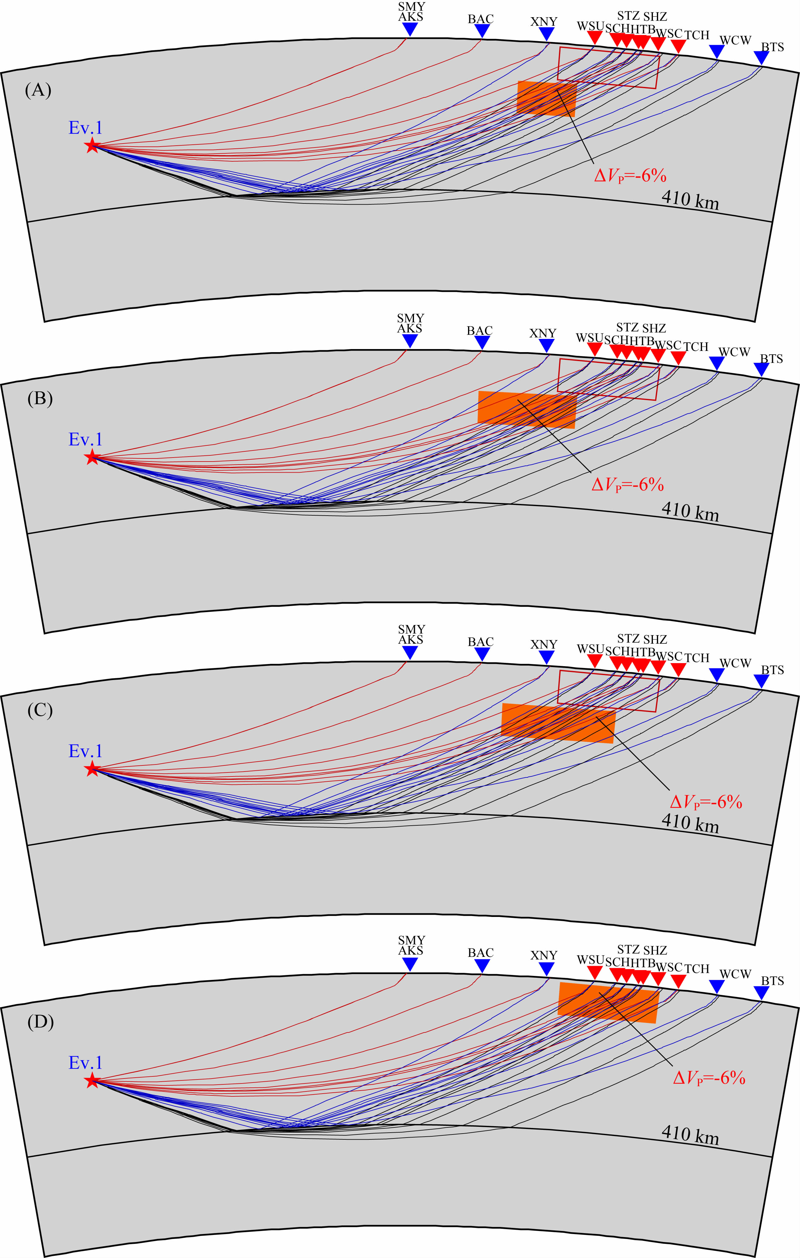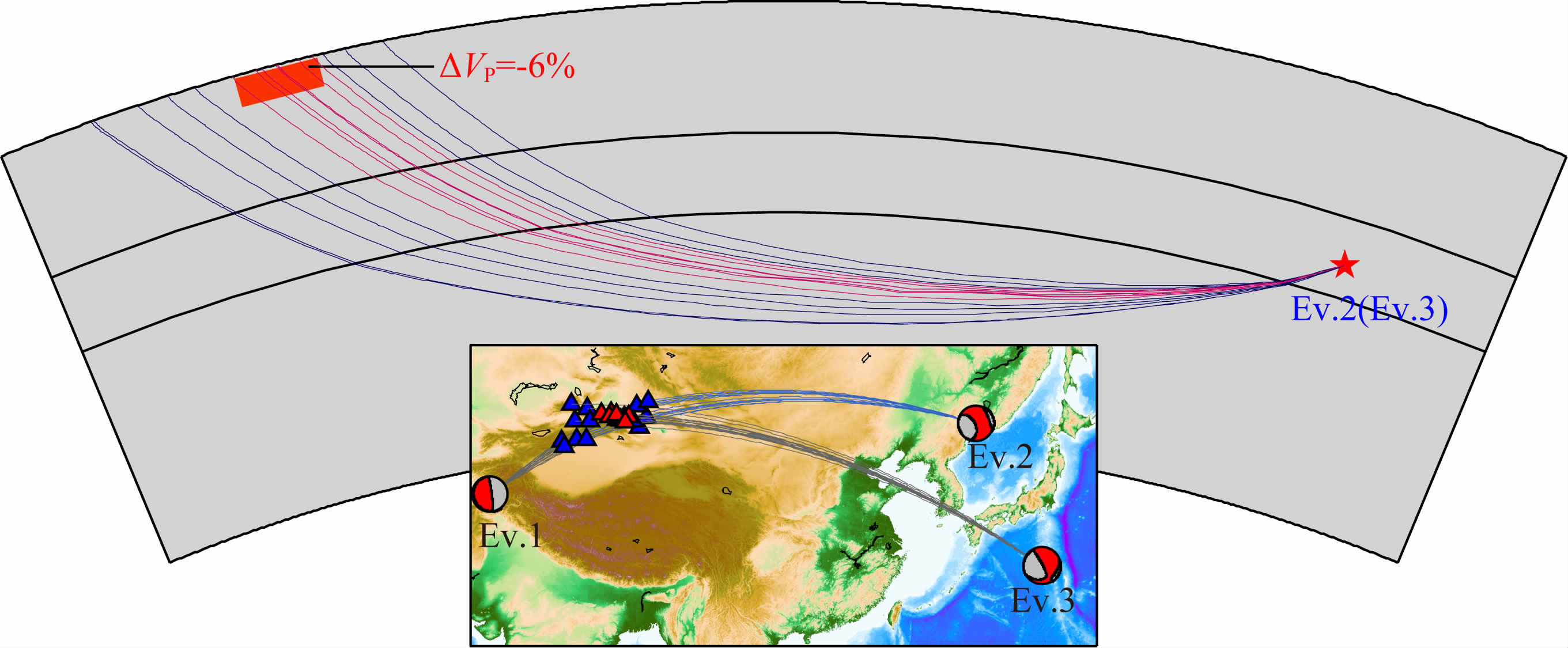 图 11 Ev.2和Ev.3远震射线路径示意图 橘色块体表示中天山东北部下方地幔顶部的低速异常体; 根据IASP91模型计算得到理论射线路径,其中蓝色和红色实线分别为插图中蓝色和红色台站所对应的射线路径; 插图中沙滩球表示地震震源机制解和震中位置,震源参数信息详见表 1; 三角形为远震测试所选用的台站的位置分布,其中红色三角形表示P波走时出现明显延迟的台站. Fig. 11 Teleseismic ray paths of the Ev.2 and Ev.3 The orange block indicates the low velocity anomaly beneath the northeastern part of central Tian Shan. The blue and red lines indicate the ray paths corresponding to the blue and red stations shown in the inset. The beach balls represent focal mechanisms and epicenter locations with detailed source information given in Table 1. The triangles indicate the location of stations for teleseismic test and the red ones note the stations with P-wave arrival distinctly delayed. |