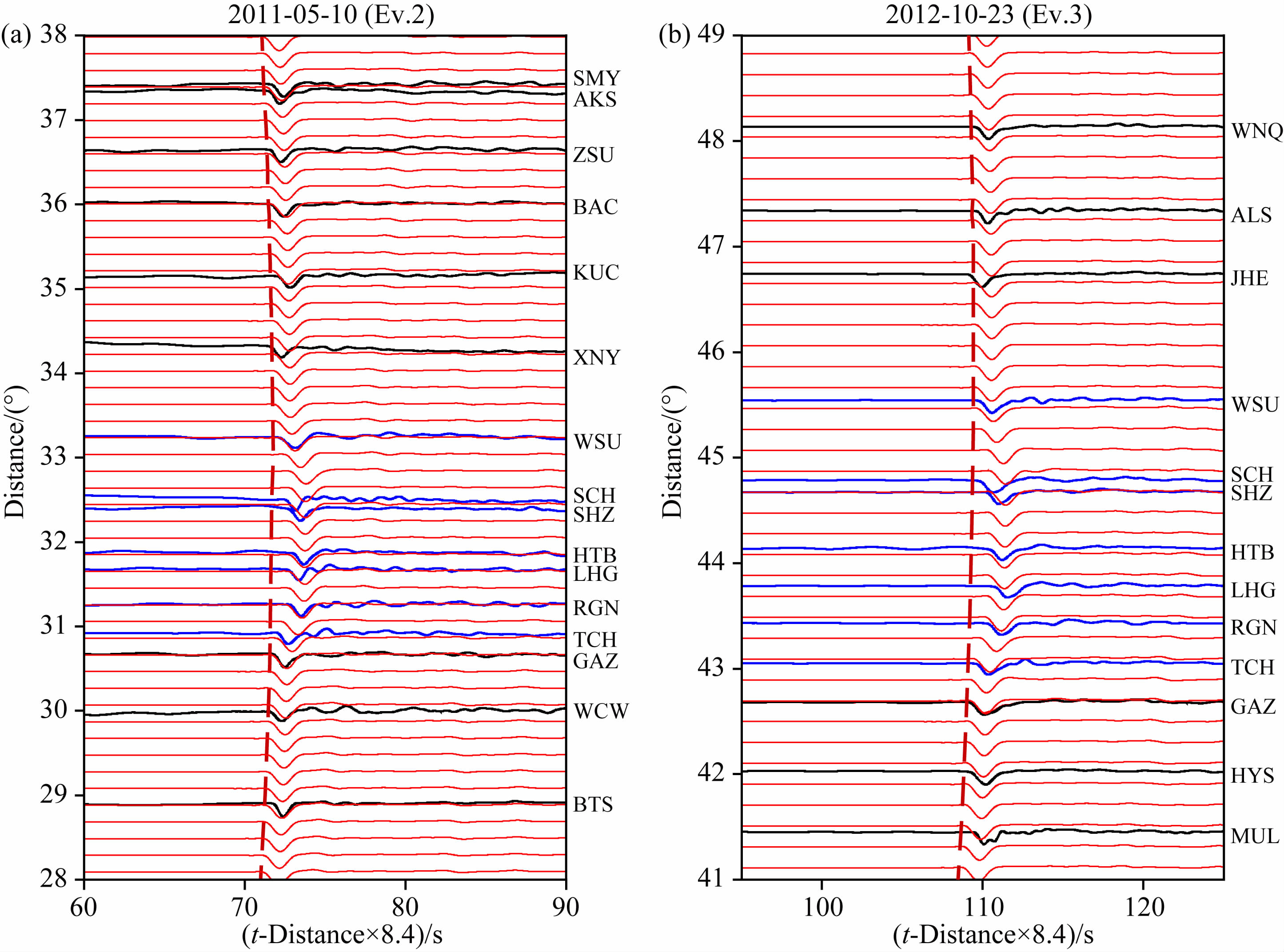 图 12 Ev.2和Ev.3观测波形及合成波形对比 图(a)和(b)中红色波形分别为Ev.2和Ev.3二维有限差分合成波形. 红色虚线为标准 IASP91 模型对应的理论走时; 黑色和蓝色为实际观测波形,其中蓝色波形为走时出现延迟的波形记录. Fig. 12 Observed and synthetic waveforms for the Ev.2 and Ev.3 In(a)and(b),red waveforms represent the 2D-FD synthetic seismograms of Ev.2 and Ev.3,respectively. The red dashed lines represent the travel times with respect to IASP91 model; The black and blue seismograms are observed records,of which the blue waveforms indicate the observed records with obvious delay. |