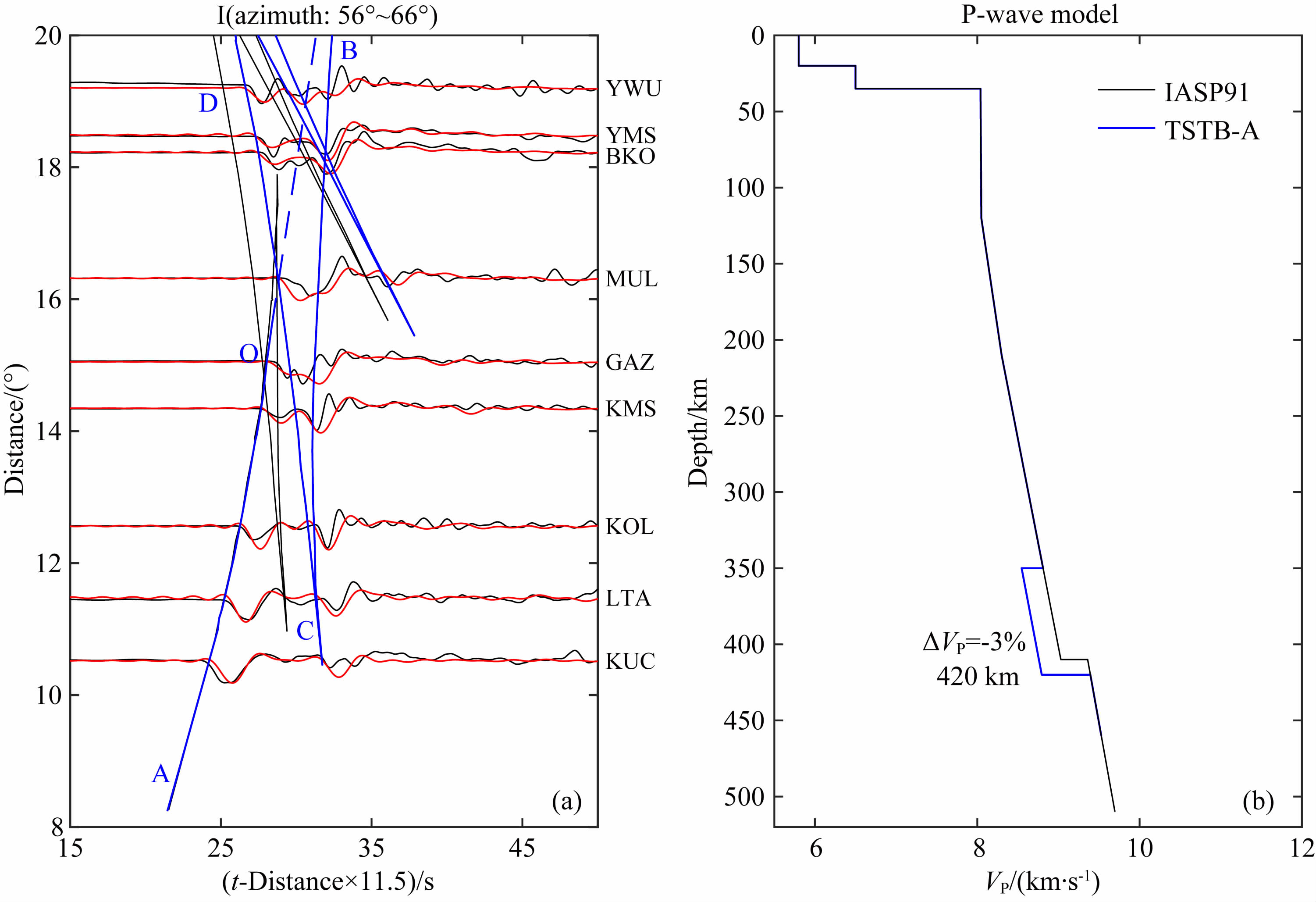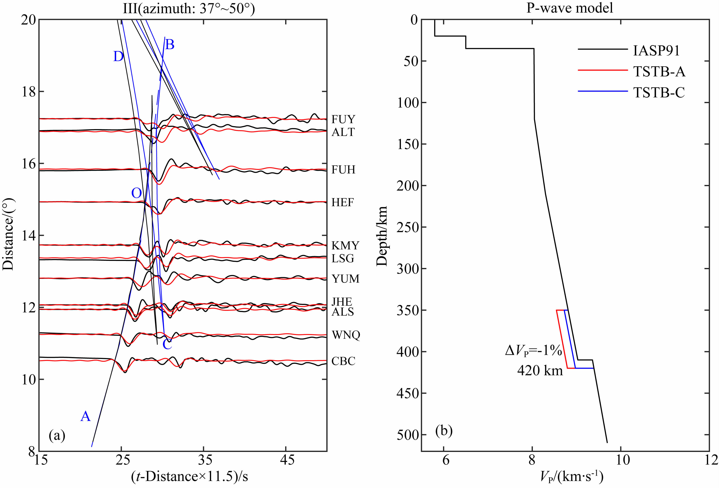 图 6 I子区域观测波形与合成波形(a)及速度模型(b) 图(a)中黑色实线和蓝色实线分别是基于IASP91和最适模型TSTB-A的理论走时; 黑色和红色波形分别表示观测波形和基于TSTB-A模型的合成波形; 图(b)中黑色实线表示IASP91速度模型; 蓝色实线表示TSTB-A模型. Fig. 6 Observed and synthetic waveforms(a)and velocity models(b)for the profile I In(a),the black and blue lines represent the travel times of the IASP91 and the best-fitting model TSTB-A,respectively. The black and red waveforms represent the observed and synthetic seismograms based on TSTB-A,respectively. In(b),the black and blue lines indicate the IASP91 and TSTB-A models,respectively. |
