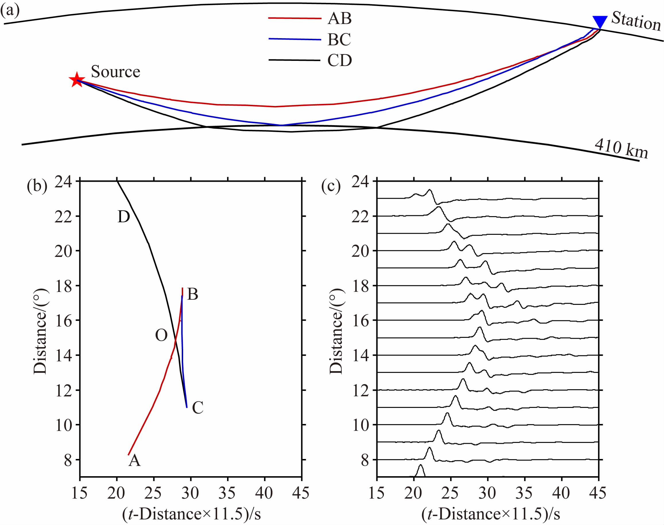 图 2 410附近P波三重震相的射线路径(a)、 理论走时(b)和合成波形图(c) 图中走时曲线,射线路径和合成波形计算所用的理论模型为IASP91(Kennett and Engdahl,1991),震源深度为241 km; 410 km间断面上方的回折波(AB),410之上的反射波(BC)及410下方的回折波(CD)分别用红色,蓝色和黑色实线表示. 图b中,字母A,B,C,D和O表示对各震相分支的标记. Fig. 2 Seismic ray paths(a),theoretical travel times(b)and synthetic seismograms(c)of the P-wave triplication across the 410 IASP91(Kennett and Engdahl,1991)is the model used for ray path,travel-time and synthetic waveforms and the focal depth is 241 km. The direct wave propagating above the discontinuity(AB),the wide-angle reflection off the discontinuity(BC),and the waves diving below the discontinuity(CD)are shown in red,blue and black lines,respectively. In(b)the phases are marked with the symbols A,B,C,D and O. |