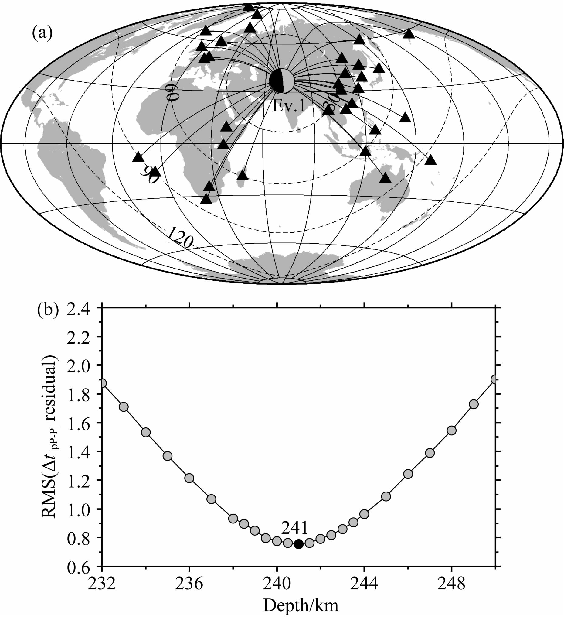 震源深度的误差会影响到三重震相的形态(Wang and Niu,2011; 崔辉辉等,2016),因此Ev.1的震源深度需要重新定位.我们从美国地震学研究联合会网站(http://www.iris.edu/[2016-06-25])收集了全球地震台网(GSN: Global Seismographic Network)30°~95°震中距范围内的波形资料(图 3a),选用了其中信噪比较好,方位角分布均匀的台站波形记录,手动读取震相pP和P到时,计算相应的走时差;基于IASP91(Kennett and Engdahl,1991)模型,对震源深度进行扰动,使pP-P的理论走时差与观测走时差的残差均方根最小(图 3b),从而获得重定位后的震源深度为241 km.