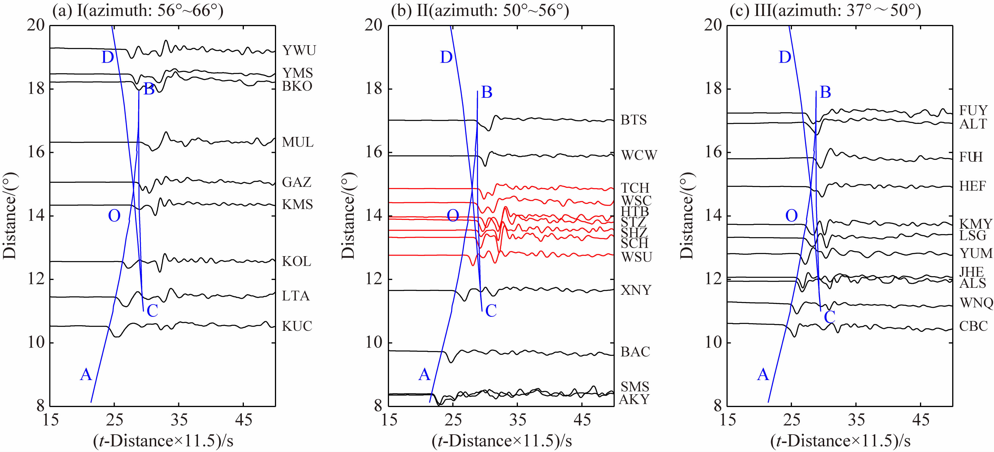 图 4 Ⅰ,Ⅱ和Ⅲ三个子区域观测P波三重震相 蓝色实线为基于IASP91模型的P波三重震相走时曲线; 字母A,B,C,D和O表示对各震相分支的标记; 图(b)中红色波形表示走时出现明显延迟的局部台站波形记录. Fig. 4 Observed P-wave triplications for the profiles Ⅰ,Ⅱ and Ⅲ The travel times of P-wave triplication based on the IASP91 are shown in blue lines. In(b),the waveforms in red mark the seismograms with the travel times obviously delayed in several local stations. |