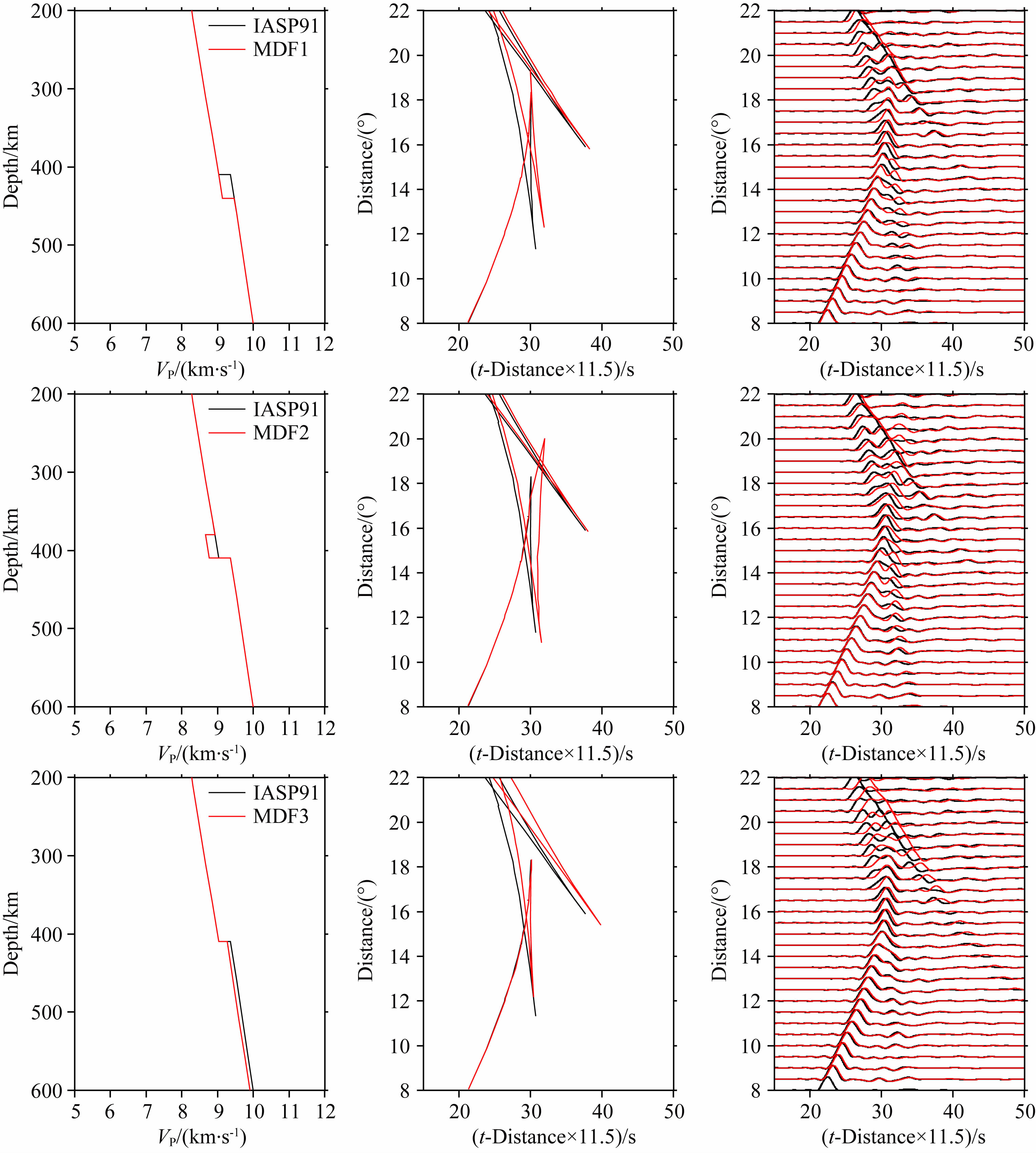 2.3 正演模拟测试通过对观测波形的观察和分析(图 4),我们在IASP91模型基础上构建了三个改进模型进行模拟测试(图 5):410 km下降至440 km(MDF1),410 km上方存在一个厚度为30 km,速度降为3%的低速层(MDF2)和410 km下方地幔转换带P波速度降低1%(MDF3).通过对比不同模型的P波走时及波形,我们可以得出不同模型下P波三重震相的变化特征,进而在观测波形中检验和测试是否存在这些特征.