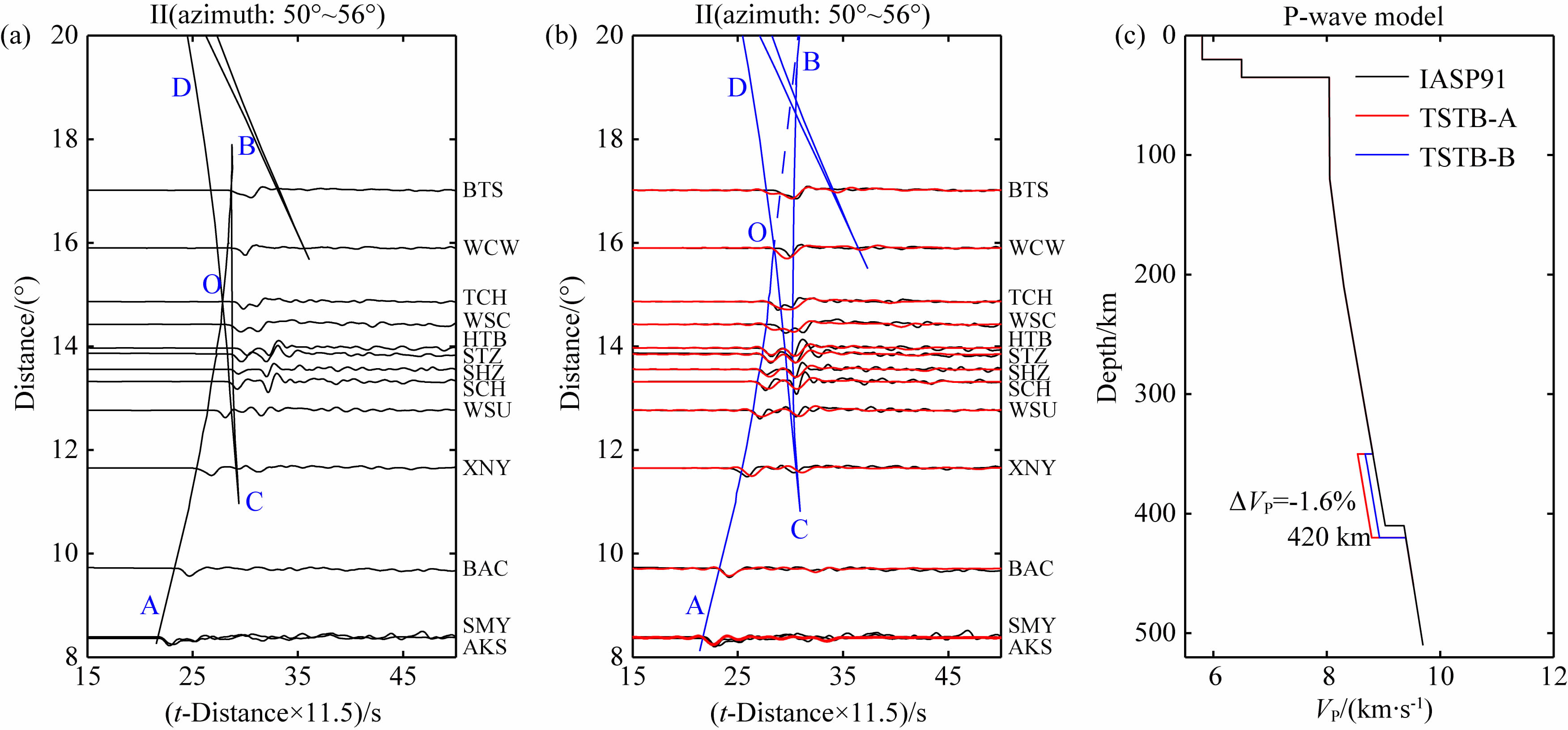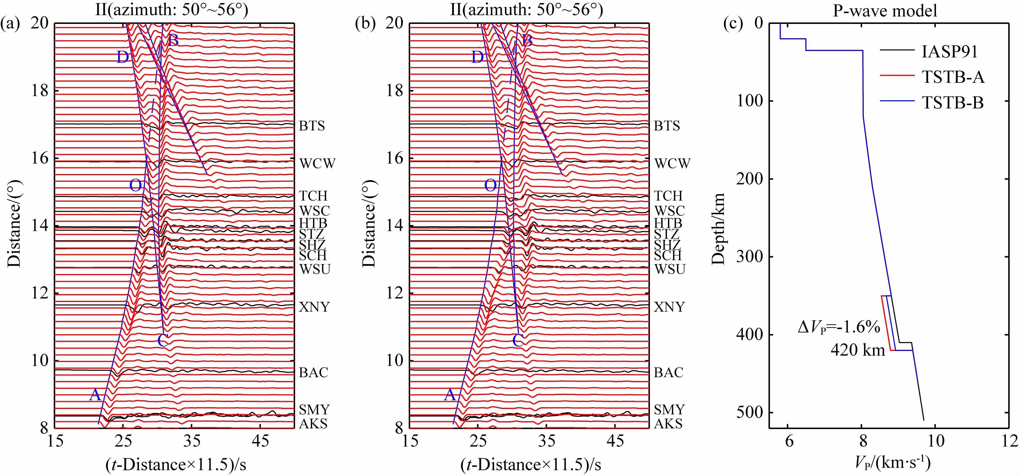 图 7 Ⅱ子区域观测波形(a)与合成波形(b)及速度模型(c) 图(a)中黑色实线为IASP91模型理论走时,黑色波形为对齐处理前实际观测波形; 图(b)中蓝色实线为最适一维模型TSTB-B的理论走时; 黑色波形为经过对齐处理后的实际观测波形,红色波形是基于TSTB-B的合成波形; 图(c)中黑色,红色和蓝色实线分别表示IASP91,TSTB-A和TSTB-B模型. Fig. 7 Observed(a)and synthetic waveforms(b)and velocity models(c)for the profile Ⅱ In(a),the black lines represent the travel times for the IASP91 and the black waveforms represent the observed seismograms before alignment to AB branch. In(b),the blue line represents the travel times of the best-fitting 1-D model TSTB-B; the black and red waveforms represent the observed waveforms after alignment to AB branch and synthetic seismograms based on TSTB-B,respectively. In(c),the black,red and blue lines indicate the IASP91,TSTB-A and TSTB-B models,respectively. |