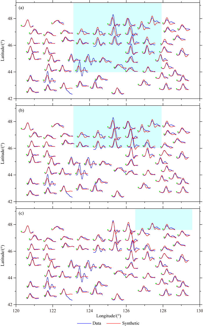 如果将600 km深以下低速异常改为高速异常(图 5c),地震波拟合情况与没有改变速度扰动时的结果基本一致(图 6c).因为对于该地震,能够记录到射线路径穿过600 km以下速度改变区的地震台站需位于北纬48°以北,而研究区域却没有相应台站.仅有部分台站(图 6c浅蓝色区域所示)波形拟合情况受到影响,与其射线路径穿过速度改变区周围速度梯度带有关.如果需要进一步确定图 5绿色椭圆所示区域600 km以下的速度异常,需要别的地震数据来约束.