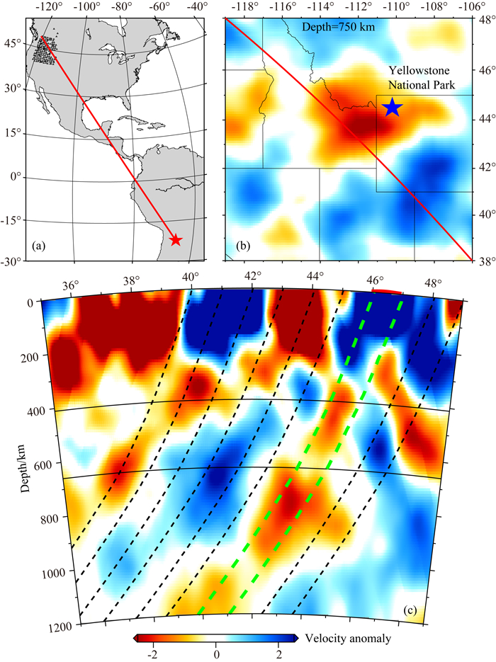 3.2 黄石地区地震波形拟合黄石火山下方地幔低速体的深度是研究黄石下方地幔柱的重要途径(James et al., 2011;Schmandt et al., 2012).层析成像结果显示,黄石下方下地幔存在一个低速异常,并且一直延伸至1000 km深处(Schmandt et al., 2012)(图 7).本文将在Schmandt等(2012)的研究基础上,进一步利用波形拟合的方法确定该低速体的结构.