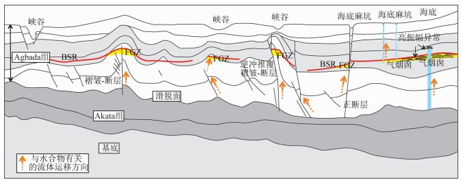 Agbaba组的快速沉积和Akata组海相泥岩的欠压实作用导致Akata组烃源岩成为超高压地层,常含超高压流体(邓荣敬等,2008).在超高压驱动下,Akata组生成的油气沿主控断层向上运移至下降盘的砂体储层中,之后沿下降盘发育的次级生长断层再次运移,聚集在有利的圈闭中形成油气藏(Hovland et al., 1997; 侯高文等,2005).工区内的天然气水合物体系,地震资料上表现为明显的BSR和FGZs,主要位于浅部的Agbaba组地层的背斜构造带(图 3,图 5).