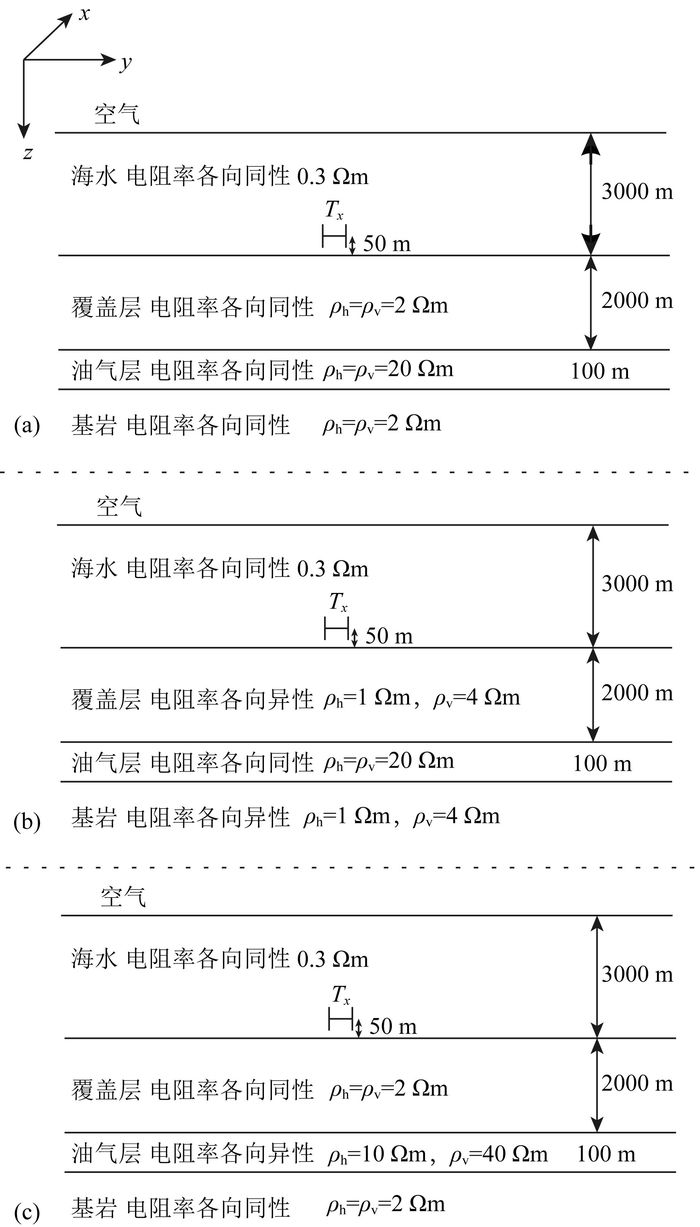 为了探讨在VTI介质中发射源和接收站姿态和位置变化对海洋CSEM响应的影响,参考徐震寰等的分析方法(Xu et al., 2016),分析发射源及接收站的方位角、倾斜角和位置变化对电阻率各向同性模型(图 1a)、围岩电阻率各向异性模型(图 1b)和高阻储层电阻率各向异性模型(图 1c)海洋CSEM响应的影响.假设海水层深度为3000 m,且为电阻率各向同性,其电阻率为0.3 Ωm,覆盖层及高阻储层厚度分别为2000 m和100 m.建立三个等效模型:当地下介质都呈现电阻率各向同性时,围岩及高阻储层电阻率分别为2 Ωm和20 Ωm(图 1a);当围岩呈现电阻率各向异性时,围岩横向电阻率ρh和垂向电阻率ρv分别为1 Ωm和4 Ωm