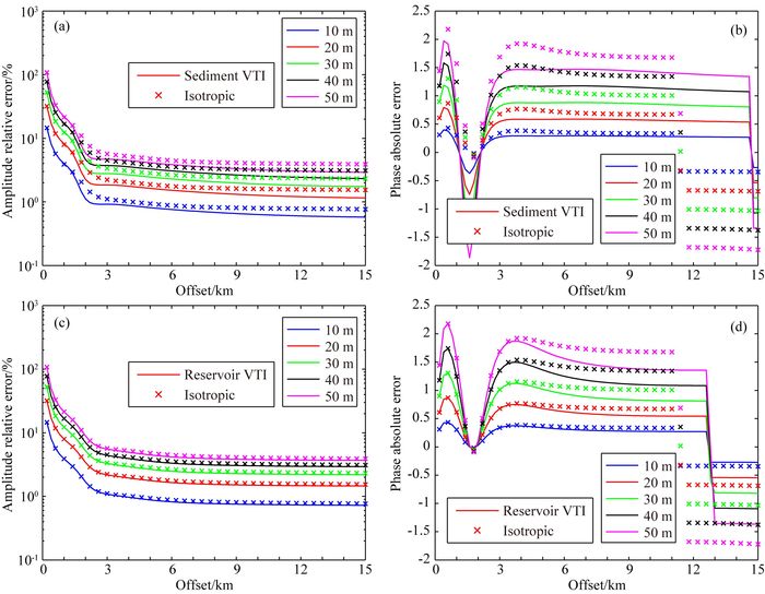 图 9 围岩呈现电阻率各向异性(a, b)和高阻储层呈现垂直各向异性(c, d)时发射源赤道方向偏移(10 m, 20 m, 30 m, 40 m, 50 m)的水平轴向电场振幅相对误差和相位绝对误差 Fig. 9 Amplitude error and phase difference of the in-line electric field excited by different transmitters with cross-line horizontal distance deviation (10 m, 20 m, 30 m, 40 m, 50 m) versus offsets for anisotropic sediment model (a, b) and anisotropic reservoir model (c, d) |