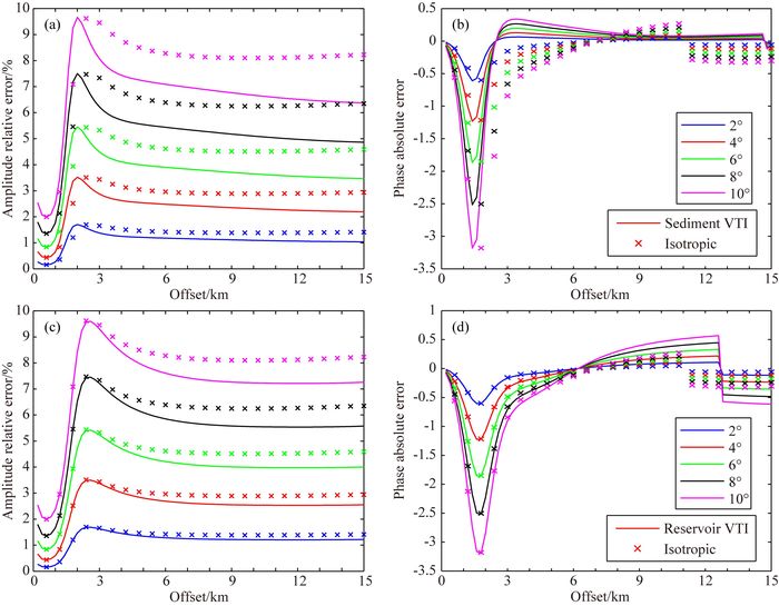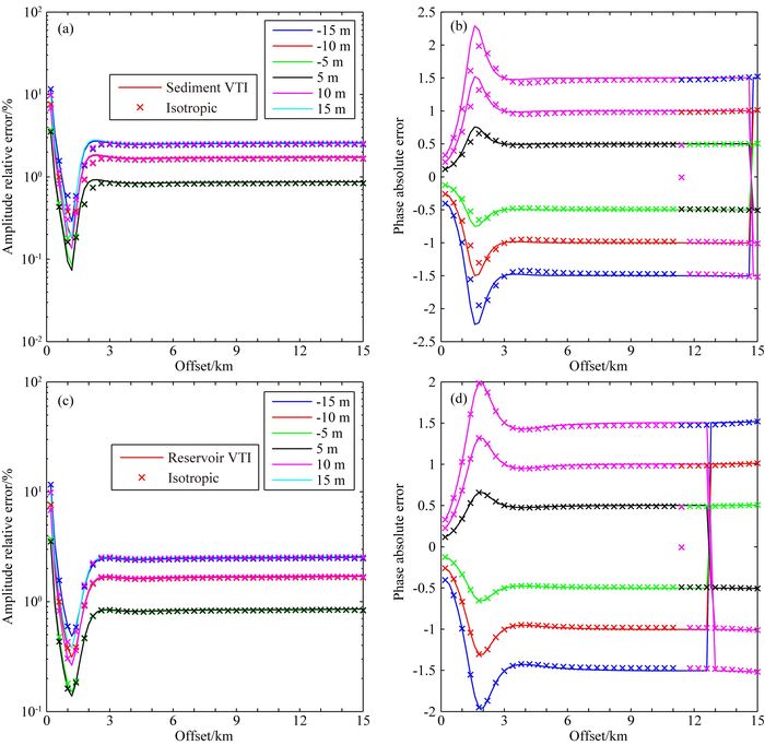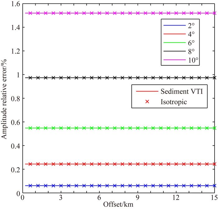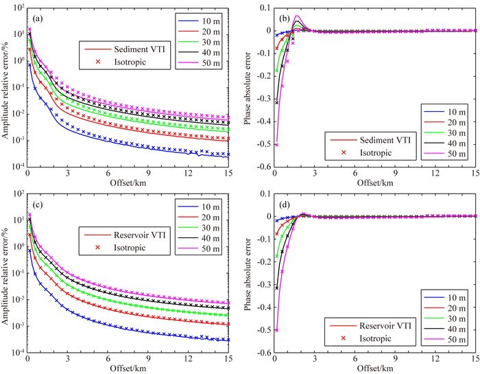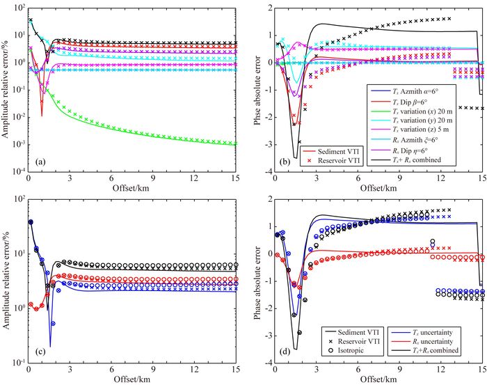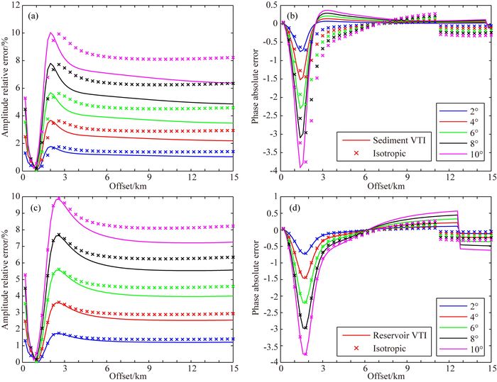 (1) 在小收发距范围内,振幅相对误差很大,然而相位绝对误差很小;在1~3 km范围内,振幅误差和相位误差都取决于倾斜角,均随着倾斜角的增大而增大;在大收发距时,各个倾斜角的振幅误差和相位误差均趋于常数.