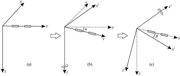 在测量参考坐标系(x, y, z)中,假设有一个在深海中拖曳的海洋CSEM发射天线(图 2a),其水平电偶极源沿着测线方向(y轴)拖曳,由于洋流等因素的影响,发射源出现了水平旋转(方位角变化α)和倾斜(倾斜角变化β).借助坐标旋转,可实现测量参考坐标系(x, y, z)到发射源旋转后的坐标系(x′, y′, z′)(简称“发射源坐标系”)的转换(图 2):首先,绕坐标系(x, y, z)的z轴顺时针旋转方位变化角α,得到新坐标系(x′, v, z)(图 2b);再将坐标系(x′, v, z)绕x′轴顺时针旋转倾斜角变化角β,得到新的坐标系(x′, y′, z′)(图 2c).倾斜角为0°的发射源为水平电偶极源(HED),设定取向与y轴平行的电偶极源(y-HED)的方位角为0°,则当发射源方位角为90°时,电偶极源(x-HED)与x轴平行,当发射源倾斜角为90°时,发射源为垂直电偶极源(VED).