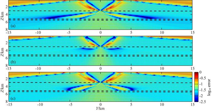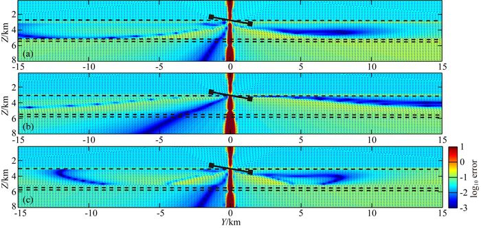 图 7 电阻率各向同性(a)、围岩电阻率各向异性(b)和高阻储层电阻率各向异性(c)模型,发射源倾斜角β=10°与倾斜角不β=0°在yoz平面能量相对误差分布 Fig. 7 The energy relative error distribution in the yoz-plane between horizontal dipoles oriented β=10° and β=0° |