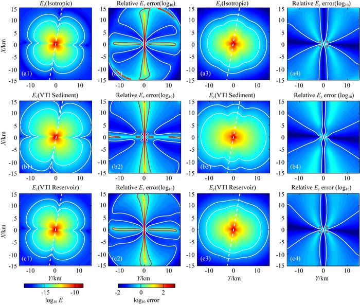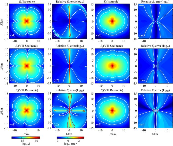 在海洋电磁勘探中,观测系统往往不局限于激发和接收在同一方向上的轴向装置或激发和接收相互垂直的赤道装置,常在多条旁侧线上同时观测以提高勘探效率.为讨论发射源方位角变化对海洋CSEM响应的影响,模拟并分析了发射源方位角α=10°时在各向同性和各向异性模型在xoy平面的电磁响应.图 5为电阻率各向同性模型(a)、围岩垂直各向异性模型(b)、高阻储层垂直各向异性模型(c)中,发射源方位角α=10°时海底面(xoy平面,测区范围为x:-15~15 km; y:-15~15 km)水平电场(第一列Ex和第三列Ey)和其与方位角α=0°时的水平电场相对误差(第二列和第四列)分布.其中,水平电场图(第一列Ex和第三列Ey)中两条白线实线分别为10-15V·Am-2(更接近发射源)和10-16V·Am-2(更远离发射源)的等值线;相对误差图(第二列和第四列)中白线实线和红线分别是10%和100%的等值线.由图 5可见: