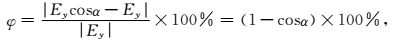由式(10)可以看出,当发射源坐标系(x′, y′, z′)中方位角为α的电偶极源转换到测量参考坐标系(x, y, z)中,其可以分解为一个偶极矩为cosα的y-HED和一个偶极矩为-sinα的x-HED.众所周知,x-HED在y取向的测线上不产生y方向的电场,在轴向装置观测到的水平电场Ey(也称为“水平轴向电场”)仅由偶极矩为cosα的y-HED产生,那么,Ey振幅的相对误差则有如下形式