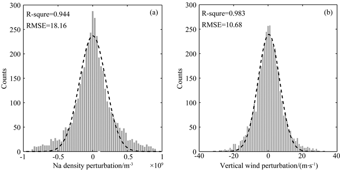 为了验证从观测数据中提取到的大气重力波扰动值的真实可靠性,需要检验扰动值的分布特性.大气重力波活动属于大气随机现象,其引起的地球物理量变化具有随机分布特性.由中心极限定理(Central Limit Theorem)可知,随机变量分布渐近于高斯分布,大量的随机变量积累分布会逐点收敛到高斯分布.根据观测数据提取到的垂直风和钠原子数密度扰动值是真实值和测量误差的和,测量误差的来源是光子噪声,虽然光子噪声属于泊松分布,但泊松分布在大样本条件下趋向于高斯分布,因此,激光雷达观测到的大气重力波扰动值(含测量误差)符合高斯随机分布过程.在实际大气中,当相互独立的波动数量足够大时,垂直风扰动、钠原子数密度扰动及测量误差就应该符合均值为0的高斯随机分布模型.