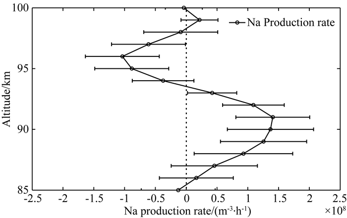 图 5给出了平均钠原子产生率廓线及其误差棒.产生率廓线经过FWHM 5 km汉明窗平滑.误差棒表示钠原子产生率的平均标准差,误差棒的大小不影响产生率最大值和最小值正负的判断.在93.5 km以下,钠原子产生率为正值,说明此范围内重力波耗散活动使得钠原子数在单位时间内净增长,平均钠原子产生率最大值在91 km处达到了1.40×108 m-3/h.结合图 3,钠层的质心高度与钠原子产生率最大值高度相一致,可见大气重力波耗散输送作用使得钠原子在91 km质心高度附近产生堆积,大气重力波耗散引起的钠原子输送作用可能对钠层质心高度附近的峰值结构特征形成起着重要作用.