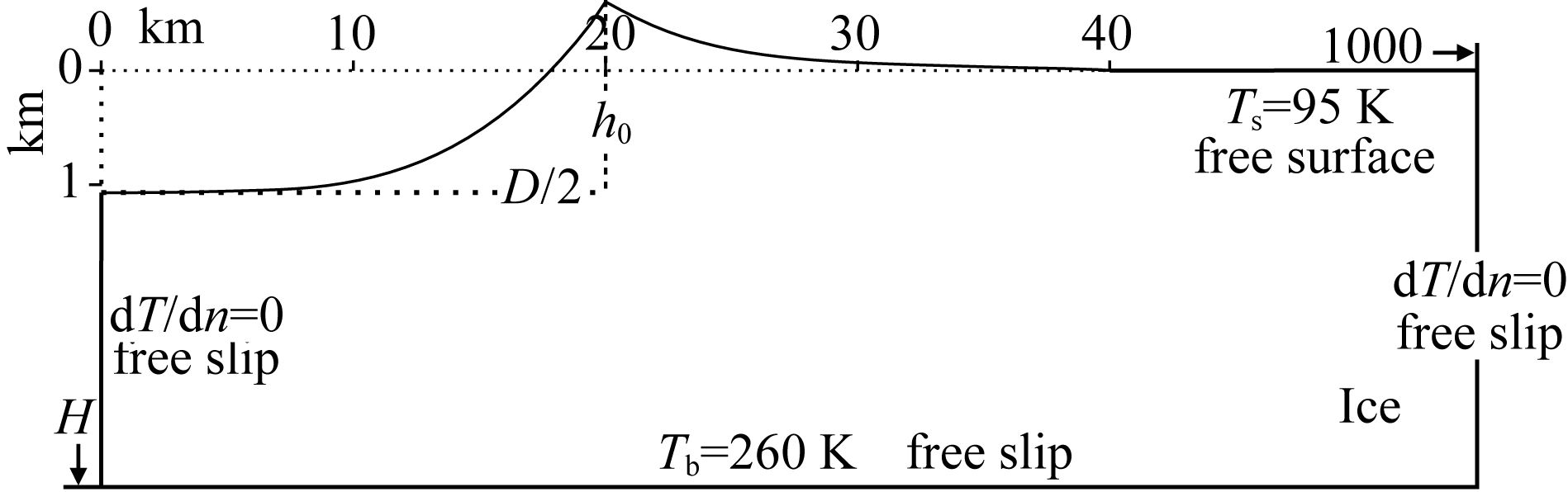 图 2 几何模型及边界条件 实线内为计算区域; D=40 km; 不同模型冰层厚度H不同.温度边界条件:顶面温度Ts=95 K, 底面温度Tb=260 K, 侧面为绝热条件; 速度边界条件:顶面为自由面 (free surface), 侧面与底面为自由滑动面 (free slip). Fig. 2 Geometric model and boundary conditions |