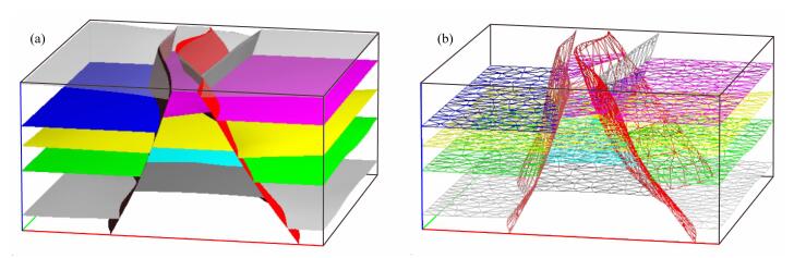 图 1 块状结构构建三维复杂堑垒构造地质模型 (a) 模型由不同的地质块组成;(b) 界面由三角形面片拼接而成. Fig. 1 3-D Complex horst and graben structure model constructed by block modeling (a) Model composed of different blocks; (b) Triangulated interfaces. |