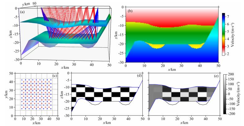 图 10 地层互切模型速度结构反演 (b)(d)(e) 剖面均位于y=25 km. (a) 两炮激发时,初始模型第二层界面的反射波射线路径; (b) 初始速度模型剖面,其中各块体的速度在垂向上均为常梯度; (c) 均匀观测系统平面分布图 (炮点数9×9,接收器数8×8),其中蓝色五角星表示炮点,红色三角形表示接收器,炮检点均位于地表; (d) 第二层原始检测板剖面; (e) 第二层检测板反演剖面. Fig. 10 Velocity inversion of layered cross-cutting model (b)(d)(e) All the profiles are located at y=25 km. (a) Reflected wave ray paths from the second interface of initial model under two blasting; (b) Initial velocity model profile, in which different blocks′ velocities are all constant gradient in vertical; (c) Plane distribution of uniform observation system (shot points 9×9, receivers 8×8). Blue stars denote shot points and red triangles denote receivers. Shot points and receivers are located on the surface; (d) Original checkerboard profile of the second layer; (e) Inversion checkerboard profile of the second layer. |