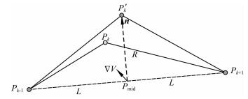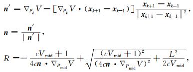 3.1 块体内部路径点的修正我们采用伪弯曲法 (Um and Thurber, 1987) 对位于块体内部的射线路径点进行修正,如图 3所示.对于连续的三个路径点,固定起始点Pk-1和终止点Pk+1,中间点Pk的修正包括方向向量n和距离R两个参数的修正: