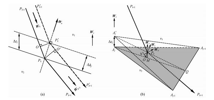 其中,Pk-1,Pk,Pk+1分别为射线路径上连续的三个路径点,Pk为落在三角形Aj-1AjAj+1上的中间路径点;ul为Pk点在三角形Aj-1AjAj+1中的面积坐标 (Xu et al., 2006);Wz为Z轴方向向量,Wt为垂直平面三角形的法向量,Wn为Pk点处重新定义的法向量 (Xu et al., 2006).一般情况下,Wn和Wt方向不一定相同,Wk和Wk+1分别为射线入射方向和出射方向的单位向量.