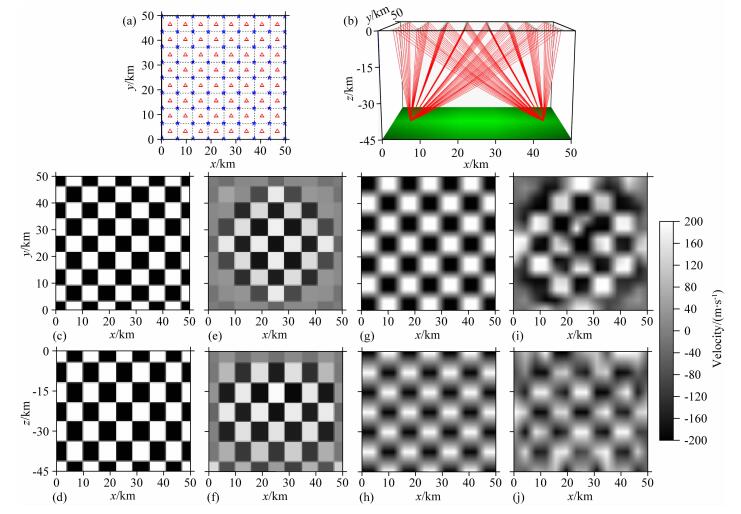 图 6 直达波反演速度结构分辨率测试 (a) 均匀观测系统平面分布图 (炮点数9×9,接收器数8×8),其中蓝色五角星表示炮点,红色三角形表示接收器,炮点位于z=-45 km,接收器位于地表,灰色虚线表示速度网格线; (b) 两炮激发时,初始模型直达波射线路径. Model 1a检测板在z=-22.5 km处的原始切片 (c) 和反演切片 (e),以及在y=25 km处的原始剖面 (d) 和反演剖面 (f). Model 1b检测板在z=-22.5 km处的原始切片 (g) 和反演切片 (i),以及在y=23 km处的原始剖面 (h) 和反演剖面 (j). Fig. 6 Resolution tests for velocity inversion based on direct waves (a) Plane distribution of uniform observation system (shot points 9×9, receivers 8×8). Blue stars denote shot points and red triangles denote receivers. Shot points are located at z=-45 km and receivers are located on the surface. Gray dashed lines denote velocity grid lines; (b) Direct wave ray paths of initial model under two blasting; (c)(e) Initial slice and inversion slice of Model 1a checkerboard at z=-22.5 km; (d)(f) Initial profile and inversion profile of Model 1a checkerboard at y=25 km; (g)(i) Initial slice and inversion slice of Model 1b checkerboard at z=-22.5 km; (h)(j) Initial profile and inversion profile of Model 1b checkerboard at y=23 km. |