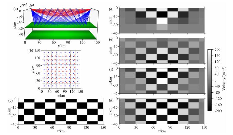 图 7 直达波和反射波反演速度结构 (c)—(g) 均为y=75 km处的检测板剖面.(a) 两炮激发时,初始模型直达波和反射波射线路径; (b) 均匀观测系统平面分布图 (炮点数9×9,接收器数8×8),其中蓝色五角星表示炮点,红色三角形表示接收器,炮检点均位于地表,灰色虚线表示速度网格线; (c) 原始检测板剖面; (d) 直达波独立反演; (e) 反射波独立反演; (f) 直达波和反射波权重系数相同时的联合反演; (g) 直达波走时对速度的偏导数乘以0.4的权重系数后的联合反演. Fig. 7 Velocity inversion based on direct waves and reflected waves (c)—(g) All the checkerboard profiles are located at y=75 km. (a) Direct wave and reflected wave ray paths of initial model under two blasting; (b) Plane distribution of uniform observation system (shot points 9×9, receivers 8×8). Blue stars denote shot points and red triangles denote receivers. Shot points and receivers are located on the surface. Gray dashed lines denote velocity grid lines; (c) Original checkerboard profile; (d) Velocity inversion based on direct wave; (e) Velocity inversion based on reflected wave; (f) Velocity inversion based on direct wave and reflected wave with the same weight; (g) Velocity inversion based on direct wave and reflected wave, with a weighting factor of 0.4 for direct wave travel-time derivative of velocity. |