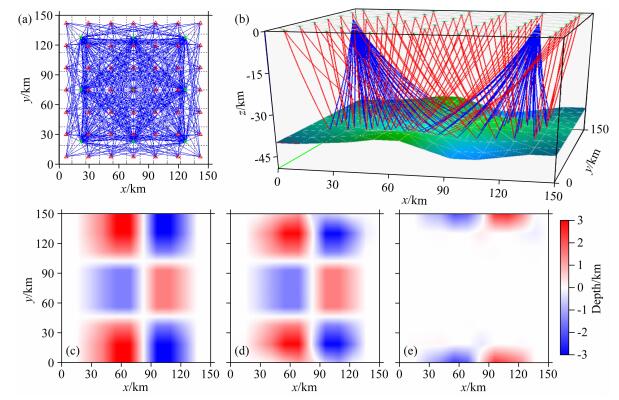 图 8 反射波反演界面深度 (a) 均匀观测系统平面分布图 (炮点数3×3,接收器数7×7),其中绿色五角星表示炮点,红色三角形表示接收器,炮检点均位于地表,灰色虚线为界面顶点网格线,蓝色实线为粗略表示的射线路径; (b) 两炮激发时理论模型反射波射线路径; (c) 理论模型界面与初始水平界面的深度差; (d) 反演界面与初始水平界面的深度差; (e) 反演界面与理论模型界面的深度差. Fig. 8 Interface depth inversion based on reflected waves (a) Plane distribution of uniform observation system (shot points 3×3, receivers 7×7). Green stars denote shot points and red triangles denote receivers. Shot points and receivers are located on the surface. Gray dashed lines denote grid lines of interface vertexes; (b) Reflected wave ray paths of real model under two blasting; (c) Depth difference between theoretical model interface and initial level interface; (d) Depth difference between inversion interface and initial level interface; (e) Depth difference between inversion interface and theoretical model interface. |
