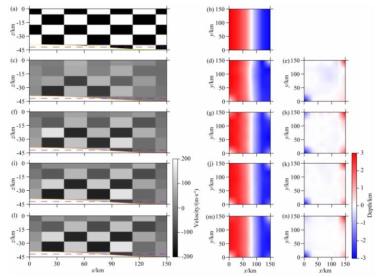 图 9 反射波联合反演速度与界面 各检测板剖面均位于y=75 km.(a) 原始检测板剖面; (b) 理论模型界面与初始水平界面的深度差; (c) 速度与界面直接联合反演; (f) 先单独反演界面再单独反演速度; (i) 基于先后独立反演结果的速度与界面直接联合反演; (l) 基于先后独立反演结果的速度与界面深度偏导数归一化后联合反演; (d)(g)(j)(m) 分别为相应的反演界面与初始水平界面的深度差; (e)(h)(k)(n) 分别为相应的反演界面与理论模型界面的深度差.图中黄色实线表示理论模型界面,紫色虚线表示初始界面,红色点线表示联合反演得到的界面. Fig. 9 Joint inversion of velocity and interface based on reflected waves All the checkerboard profiles are located at y=75 km. (a) Original checkerboard profile; (b) Depth difference between theoretical model interface and initial level interface; (c) Direct joint inversion; (f) Independent velocity inversion after independent interface inversion; (i) Direct joint inversion based on independent inversion result; (l) Joint inversion based on independent inversion result after partial derivative normalization; (d)(g)(j)(m) are corresponding depth difference between inversion interface and initial level interface; (e)(h)(k)(n) are corresponding depth difference between inversion interface and theoretical model interface. In these profiles, yellow lines denote theoretical model interface. Purple dashed lines denote initial interface and red dot lines denote interface of joint inversion. |
