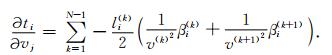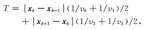 其中,v(k)和v(k+1)为离散射线路径段 (直线) 的起始点和终止点处的速度.则走时对网格节点速度的偏导数为