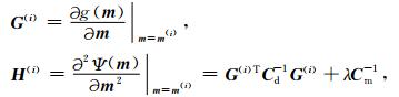 其中,g(m) 和dobs分别为理论计算的走时数据和实际观测的走时数据;λ为正则化参数,一般为正值并随着迭代次数的增加而减小;mp为先验模型参数,Cd和Cm分别为估计的数据和模型协方差矩阵.相应的Jacobian矩阵和近似Hessian矩阵形式如下: