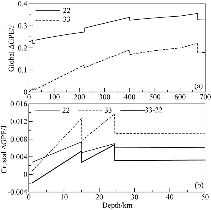 与上述结果正好相反,从图 1b可以看出:只要不是太浅的地震,垂直拉张断层产生的地壳重力位能变化要比水平拉张断层产生的地壳重力位能大.但如果震源深度小于4.7 km(所采用的地球模型不同,该值有少许的变化),则结果正好相反.图中只给出了震源深度在1~50 km的结果,这是因为大地震的震源深度通常在这个范围之内.随着震源深度的增大,图中的曲线慢慢向上直到转换带,然后向下,但一直到700 km仍是大于0的.因此,当震源深度大于4.7 km时,正断层导致地壳重力位能减小,而逆冲断层导致地壳重力位能增大.通常正断层对应于拉张构造,而逆冲断层对应于挤压构造.所以Tanimoto和Okamoto(2000)指出地壳重力位能的同震变化能够很好地反映构造活动是拉张或是挤压的状态.尽管这种状态实际上完全决定于断层滑动角,但是采用地壳重力位能的同震变化相较于采用震源机制(震源小球)能够更加直观、并且能够定量地描述构造活动的状态.也必须看到,采用全球重力位能的同震变化同样也可以反映出构造活动的状态,只是其反映的构造活动的挤压或拉张状态与地壳重力位能变化正好相反.