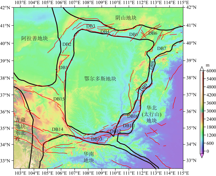 图 1 研究区主要块体、盆地及断层分布(块体划分据张培震等, 2003, 断层分布据邓起东和尤慧川,1985) 图中黑色线表示块体边界;红色线表示断层;DB1银川盆地;DB2吉兰泰盆地;DB3临河盆地;DB4白彦花盆地;DB5呼和盆地;DB6岱海盆地;DB7大同盆地;DB8忻定盆地;DB9太原盆地;DB10临汾盆地;DB11灵宝盆地;DB12运城盆地;DB13渭河盆地;DB14靖远盆地;DB15海原盆地. Fig. 1 The distribution of geology blocks (Zhang et al., 2003)、fault basins and seismic faults (Deng and You, 1985) Black lines represent boundary of blocks, red lines represent faults. DB1 Yinchuan basin; DB2 Jilantai basin; DB3 Linhe basin; DB4 Baiyanhua basin; DB5 Huhe basin; DB6 Daihai basin; DB7 Datong basin; DB8Xinding basin; DB9 Taiyuan basin; DB10 Linfen basin; DB11 Linbao basin; DB12 Yuncheng basin; DB13 Weihe basin; DB14 Jingyuan basin; DB15 Haiyuan basin. |