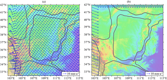 岩石圈底面的起伏形态和运动速度的空间分布,直接影响软流圈顶部物质的运移.受温压环境以及重力均衡效应影响,岩石圈底面起伏不平.Zang等(2005)考虑岩石圈物质流变特性,结合地震波速结构和热结构,提出了研究区岩石圈底面边界的深度(见图 2a),本文据此确定软流圈模型中顶部边界的起伏变化(见图 2b).在较短的时间尺度内,中国大陆运动和构造应力场总体格局基本稳定(Wang et al., 2001),地质资料推断的地壳水平运动速度与GPS观测的地表形变速度,两者结果较接近(刘峡等,2010),因此本文利用GPS观测结果(采用研究区1999—2007年GPS观测数据),通过数据内插,确定在20万年时间尺度下(参考郑勇等,2006),岩石圈顶部的水平运动速度.由于岩石圈浅部与深部变形的定量关系尚无确切估计,参考刘峡等(2010)开展华北地区地壳运动动力机制研究采用的方法和获得的结果,本研究中假定岩石圈深部和浅部的水平运动方向一致,速率自上而下逐渐增大,至100 km深度运动速度为地表速度的1.2倍,据此计算获得岩石圈底面的水平运动速度,并将其作为约束条件,施加在软流圈顶部,从而确定模型中顶部边界的水平运动速度(见图 3a),同时设定该边界垂向运动自由.
