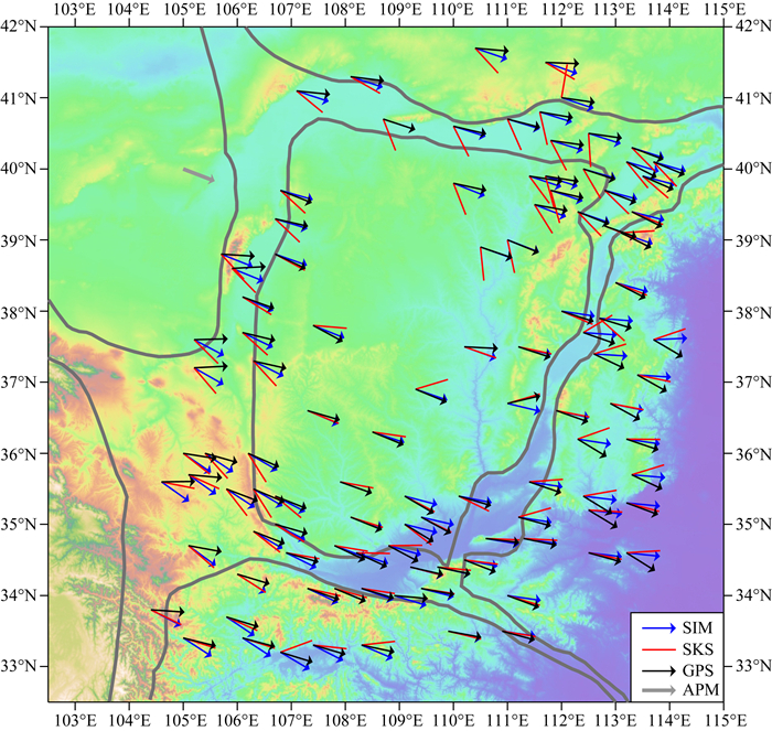 整体而言,在鄂尔多斯块体及周缘底部,模拟获得的软流圈物质的水平流向与APM方向基本平行,与大部分SKS快波偏振方向偏差较小,模拟结果基本能客观反映研究区软流圈物质的运动趋势.